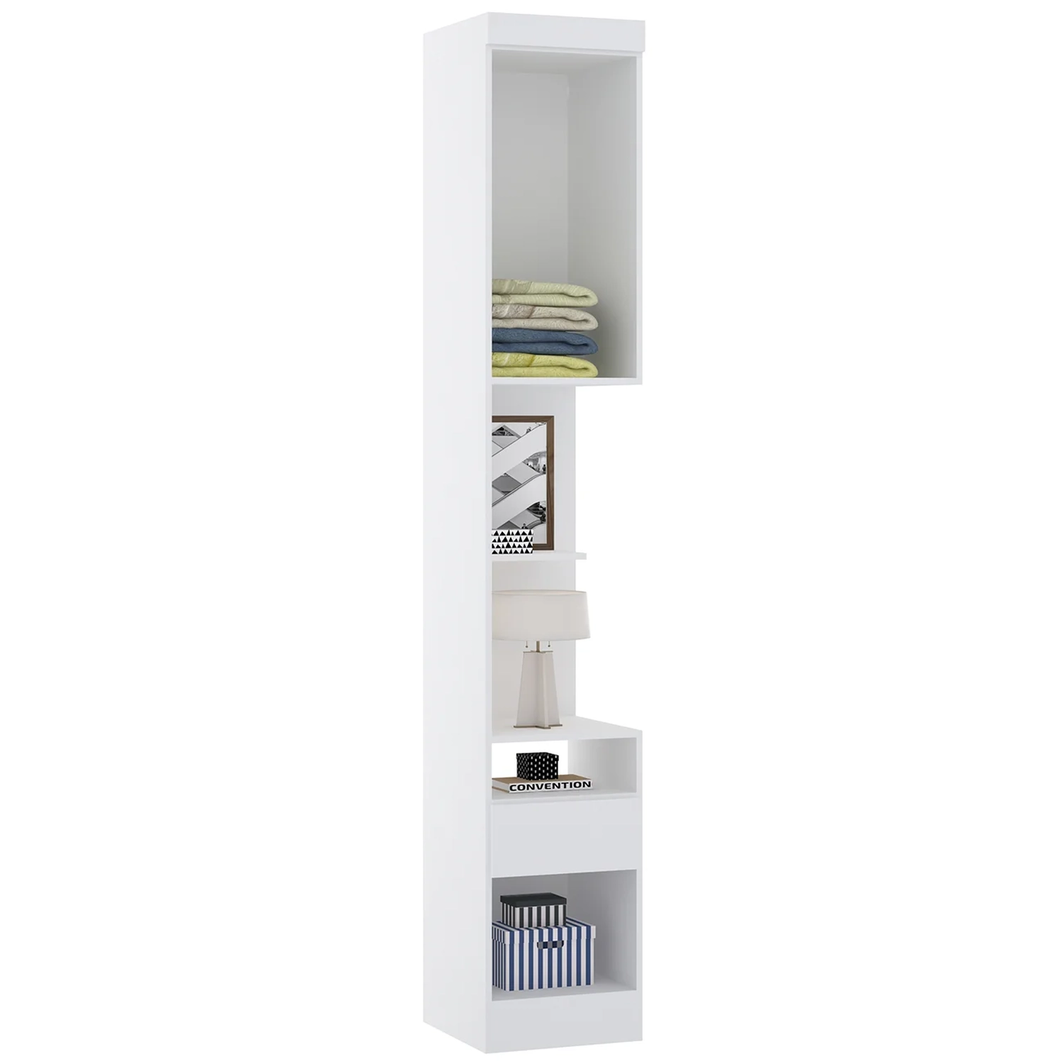 Na parte de baixo, ela conta com uma gaveta com corrediça telescópica e dois nichos abertos que servem tanto para organização quanto para dar aquele charme com itens decorativos ou livros.