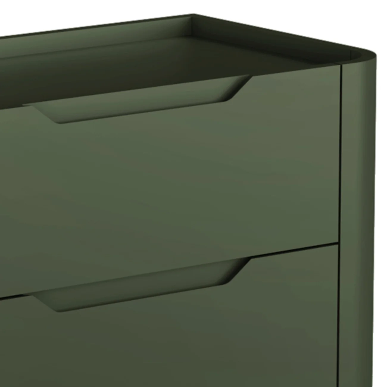 A frente das gavetas em cava usinada dispensa o uso de puxadores, destacando linhas modernas e minimalistas. Já as corrediças telescópicas garantem abertura suave, trazendo conforto no uso diário, seus cantos arredondados completam o design.