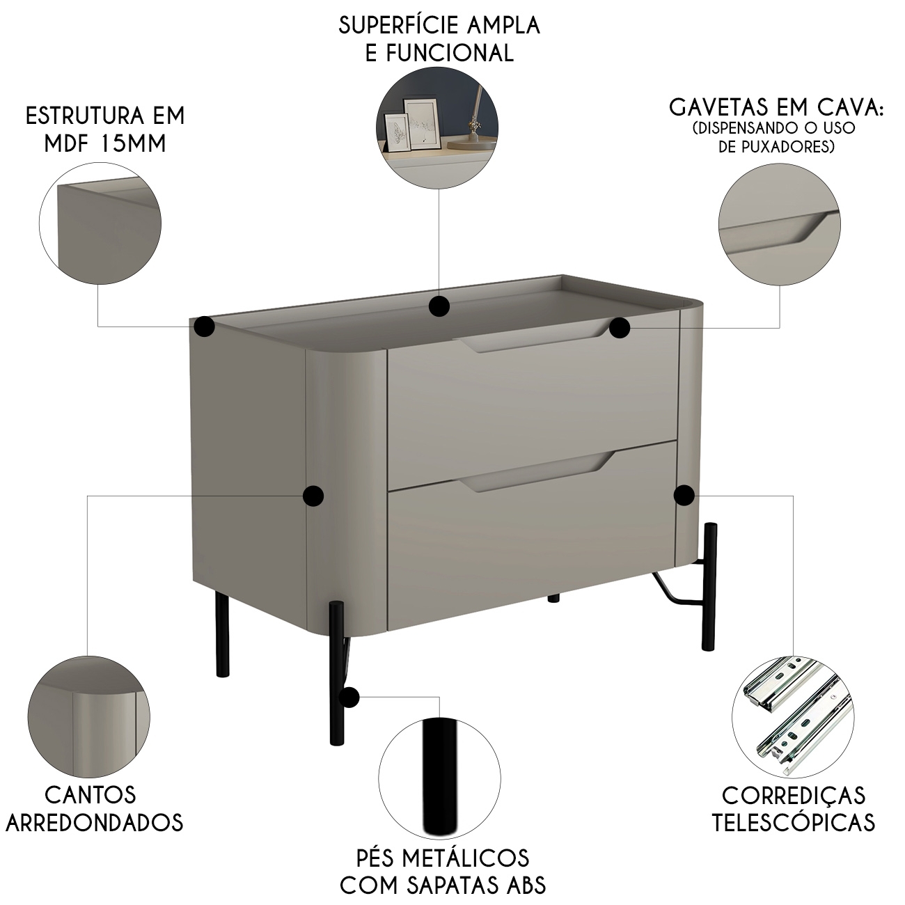 Mesa Cabeceira Quarto 68cm 2 Gavetas Becca Grigio/Preto I06 - Mpozenato
