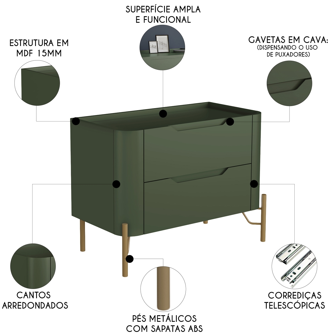 As frentes das gavetas possuem cava usinada, dispensando puxadores tradicionais e conferindo linhas limpas e modernas. As corrediças telescópicas garantem abertura suave, trazendo maior conforto no manuseio. Os cantos arredondados complementam o design, oferecendo segurança e sofisticação.