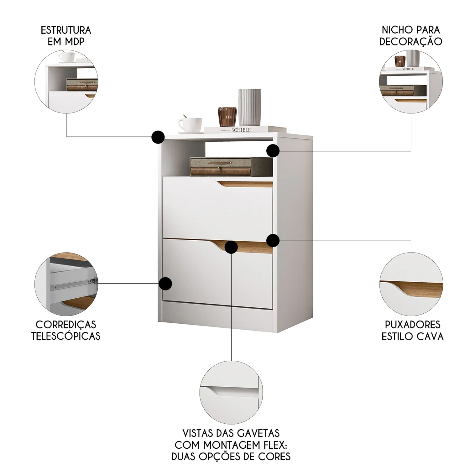 Além disso, também possui um nicho aberto, perfeito para exibir objetos decorativos ou armazenar livros e revistas. Já a combinação de cores adiciona um toque de elegância e sofisticação ao ambiente. Ah, e você ainda pode escolher a cor das vistas, pois conta com montagem flex. Seja para um quarto de casal ou quarto de solteiro, essa mesa lateral é uma adição versátil e funcional à sua decoração. Sua qualidade e design moderno garantem durabilidade e estilo por muitos anos.