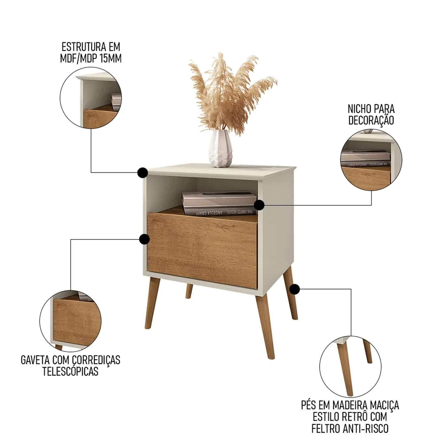 - Pés de madeira maciça com feltro anti-risco.