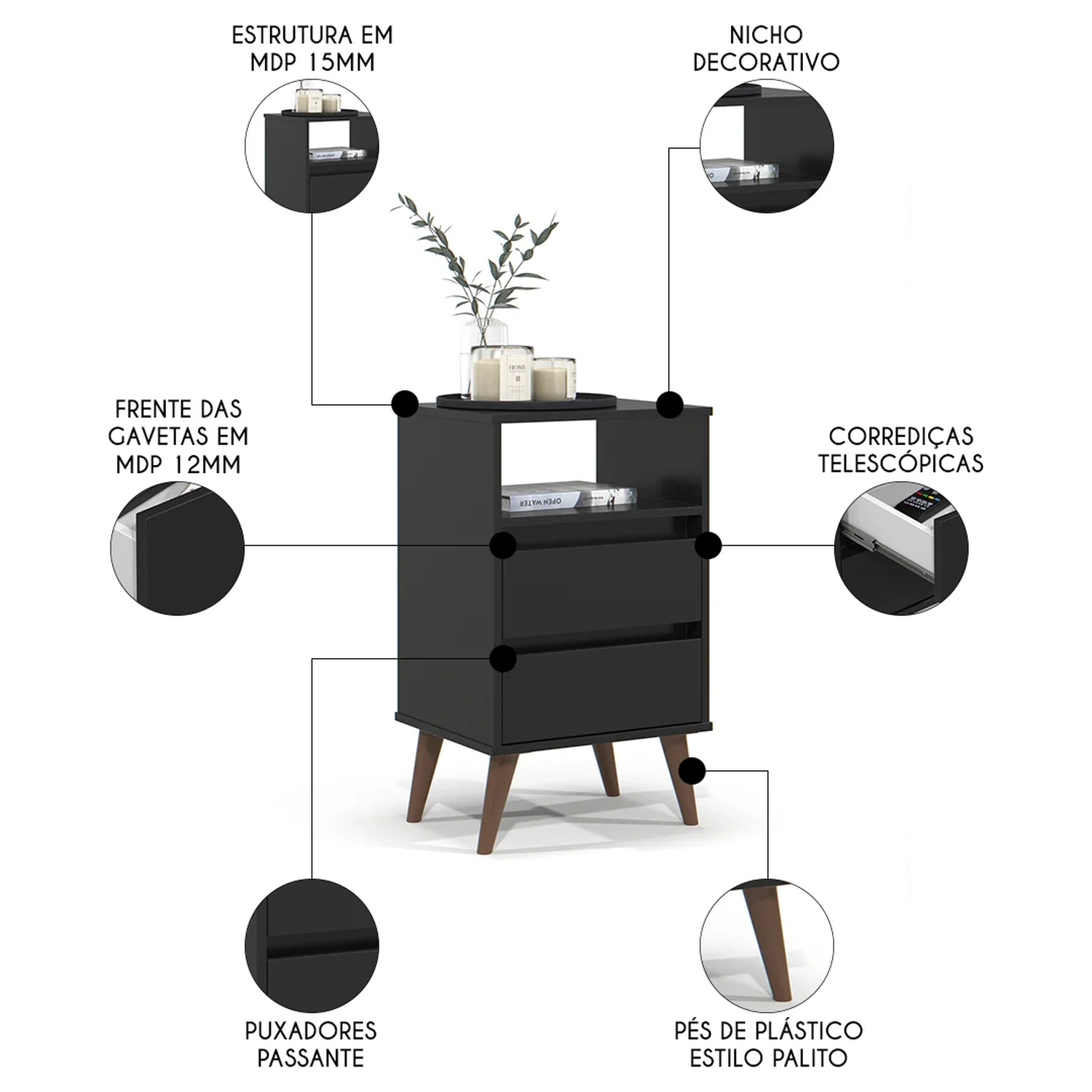 A Mesa de Cabeceira Pés Retrô 2 Gavetas 43cm Roma Preto, da EJ Móveis, é o complemento perfeito para o seu quarto dos sonhos. Com um design elegante e moderno, essa mesa de cabeceira é a solução ideal para quem procura adicionar um toque de sofisticação ao seu ambiente.