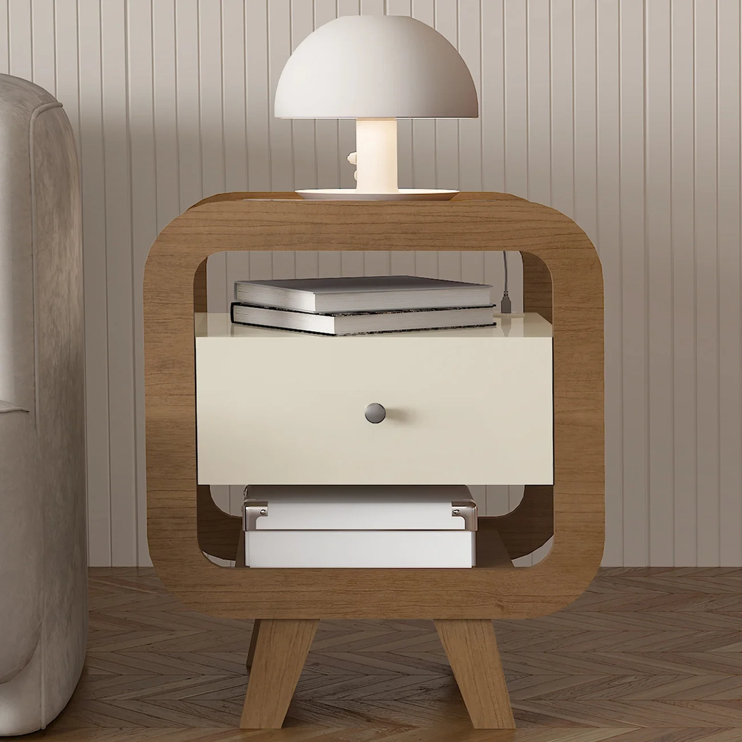 Esta Mesa Lateral possui cantos suavemente arredondados garantem segurança e um visual harmônico, enquanto os puxadores delicados acrescentam um charme sutil e refinado ao design.