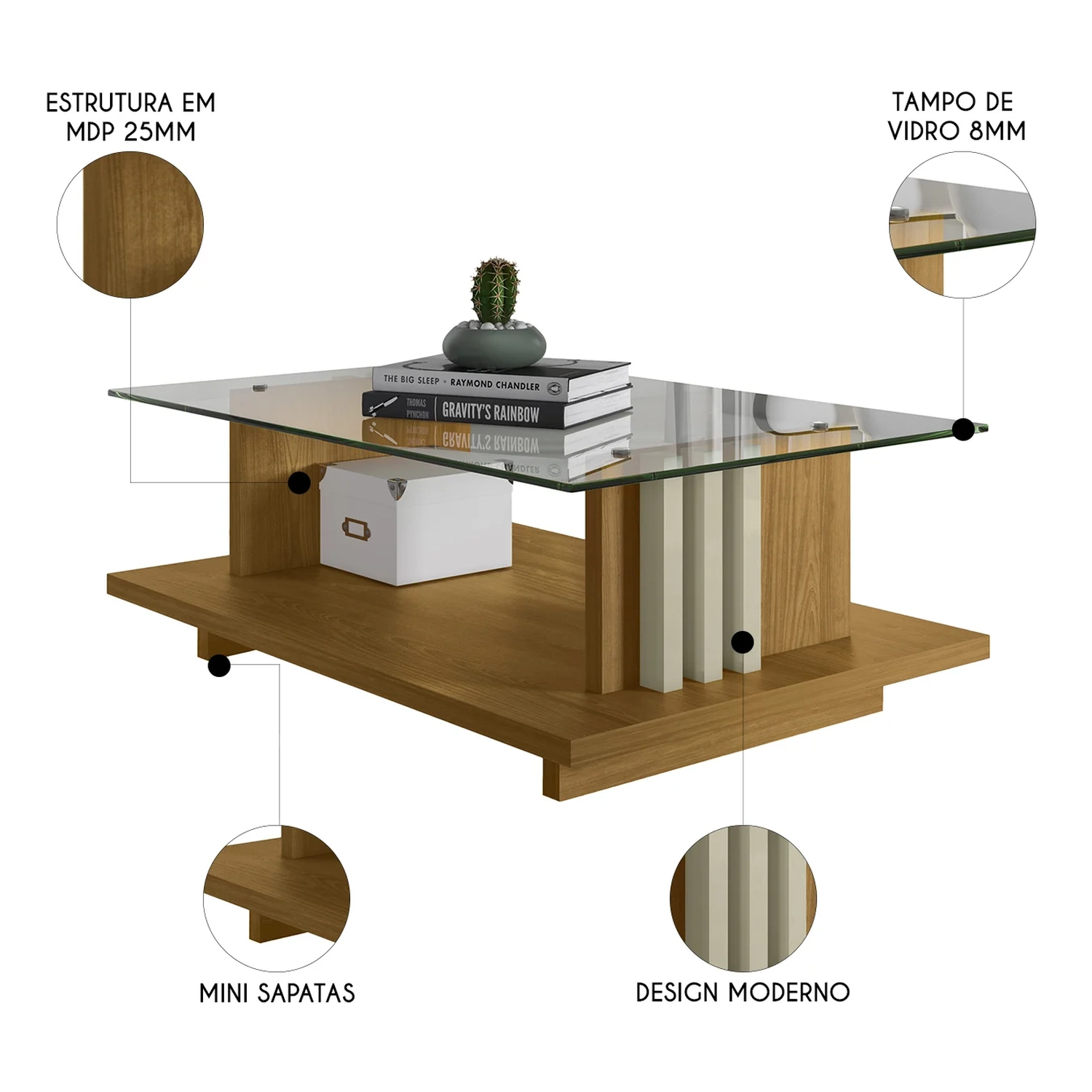 Sua estrutura é feita em MDP, um material resistente que garante durabilidade, enquanto o tampo de vidro com cantos arredondados proporciona um acabamento sofisticado a Mesa de Centro, adicionando leveza e charme ao ambiente. O detalhe ripado presente na mesa confere um toque único e contemporâneo, tornando a peça ainda mais atraente. As sapatas oferecem estabilidade e proteção ao piso, garantindo maior segurança e praticidade. Essa Mesa de Centro Para Sala é perfeita para organizar o ambiente, sendo ideal para apoiar objetos decorativos, revistas ou até mesmo para um jantar rápido.