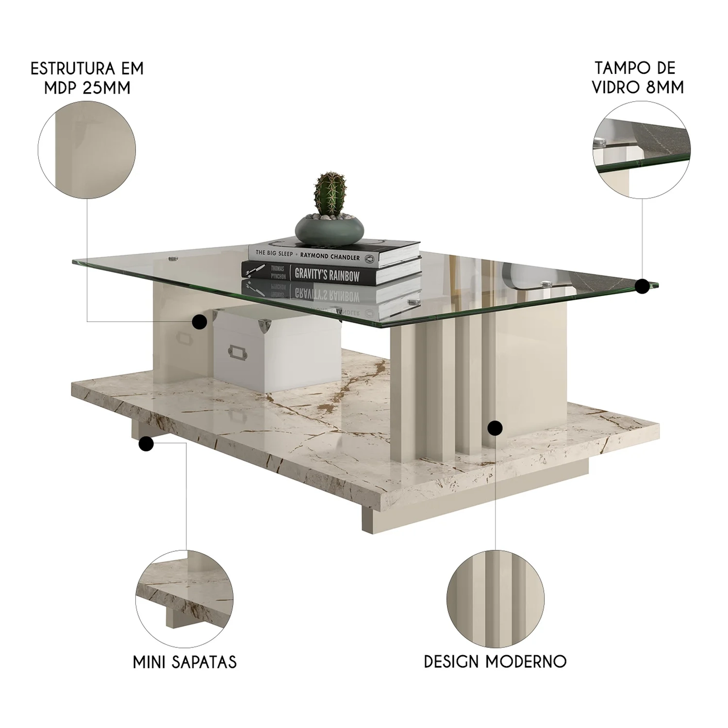 Sua estrutura é feita em MDP, um material resistente que garante durabilidade, enquanto o tampo de vidro com cantos arredondados proporciona um acabamento sofisticado a Mesa de Centro, adicionando leveza e charme ao ambiente. O detalhe ripado presente na mesa confere um toque único e contemporâneo, tornando a peça ainda mais atraente. As sapatas oferecem estabilidade e proteção ao piso, garantindo maior segurança e praticidade. Essa Mesa de Centro Para Sala é perfeita para organizar o ambiente, sendo ideal para apoiar objetos decorativos, revistas ou até mesmo para um jantar rápido.