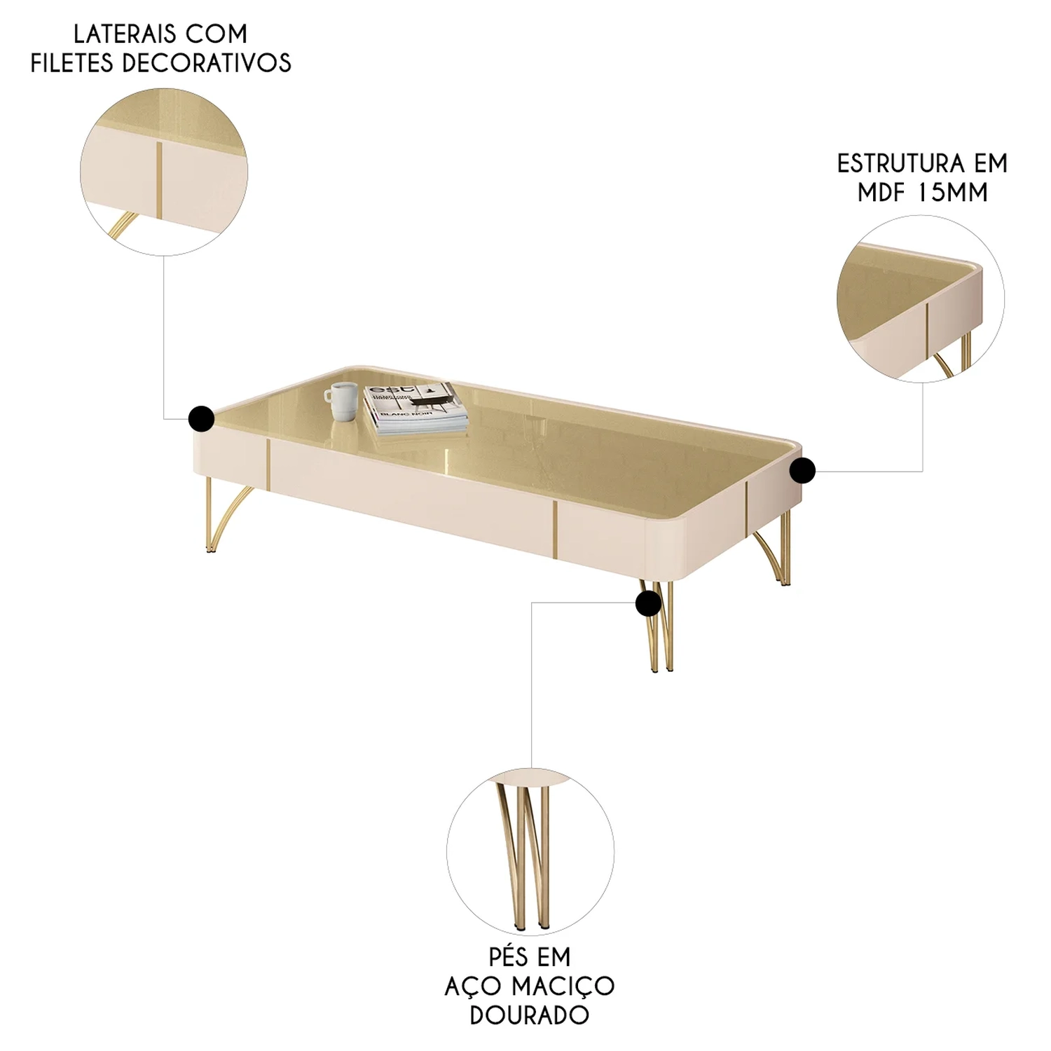 Produzida em MDF de 15mm, o tampo com impressão UV texturizada garante durabilidade e facilidade na limpeza. Os pés em aço maciço dourado reforçam a estrutura.