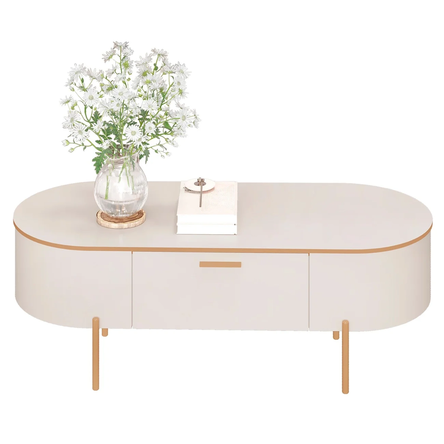 Seu estilo sofisticado apresenta laterais curvas e tampo usinado com cantos arredondados, adornado com pintura PU dourada, seguindo as tendências de decoração mais atuais. Com uma gaveta equipada com corrediça telescópica e puxador metálico dourado, oferece um espaço prático e funcional para organizar seus objetos. Produzida MDF de alta qualidade, a estrutura da Mesa de Centro para Sala é reforçada com pés metálicos cilíndricos dourados, garantindo durabilidade e facilidade na limpeza. Este móvel não só embeleza o ambiente, mas também se harmoniza perfeitamente com outros elementos de decoração, tornando seu espaço ainda mais aconchegante. Aproveite para transformar sua Sala de Estar com a Mesa de Centro e adicione um toque especial de charme e funcionalidade ao seu lar.