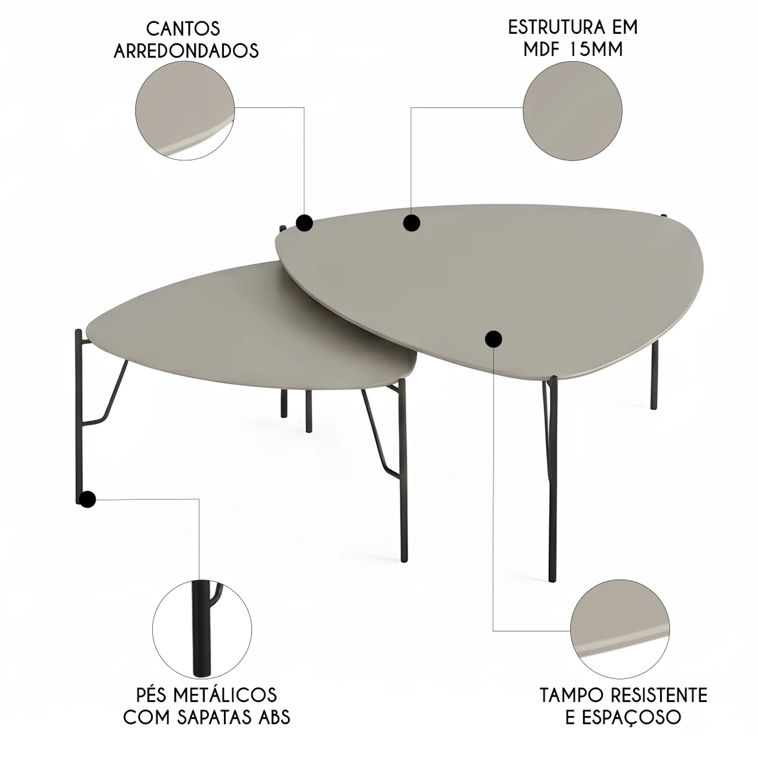 O visual contemporâneo se destaca pelo formato orgânico das peças, que se encaixam de forma harmoniosa e possibilitam tanto o uso conjunto quanto separado, atendendo diversas necessidades de apoio e decoração.