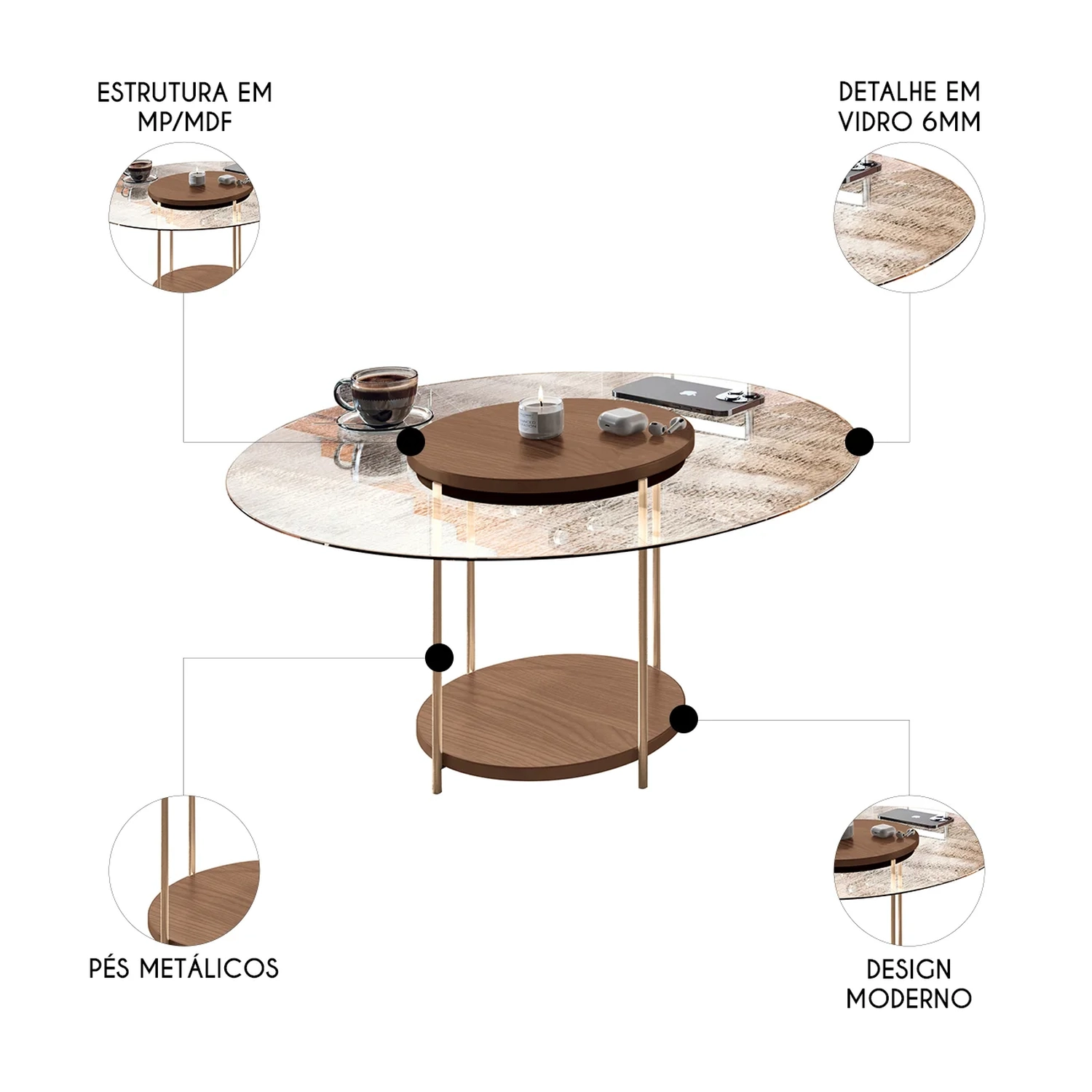 O tampo de vidro de 6mm adiciona elegância e transparência, permitindo que o ambiente ao redor seja visualmente integrado à peça. Os pés de aço maciço 3/8 com acabamento dourado oferecem uma base sólida e resistente, ao mesmo tempo que conferem um toque de luxo ao móvel. Esse contraste entre o vidro, MDF e o metal na Mesa De Centro cria uma composição visualmente equilibrada e sofisticada, ideal para ambientes modernos. Conta também com prateleira inferior em MDF para apoiar objetos ou decorações. Além de sua estética refinada, a Mesa Decorativa oferece possibilidade de uso conjunto, permitindo a criação de composições versáteis e funcionais. A escolha perfeita para quem busca um móvel elegante, durável e que complemente de forma prática a decoração de qualquer ambiente.