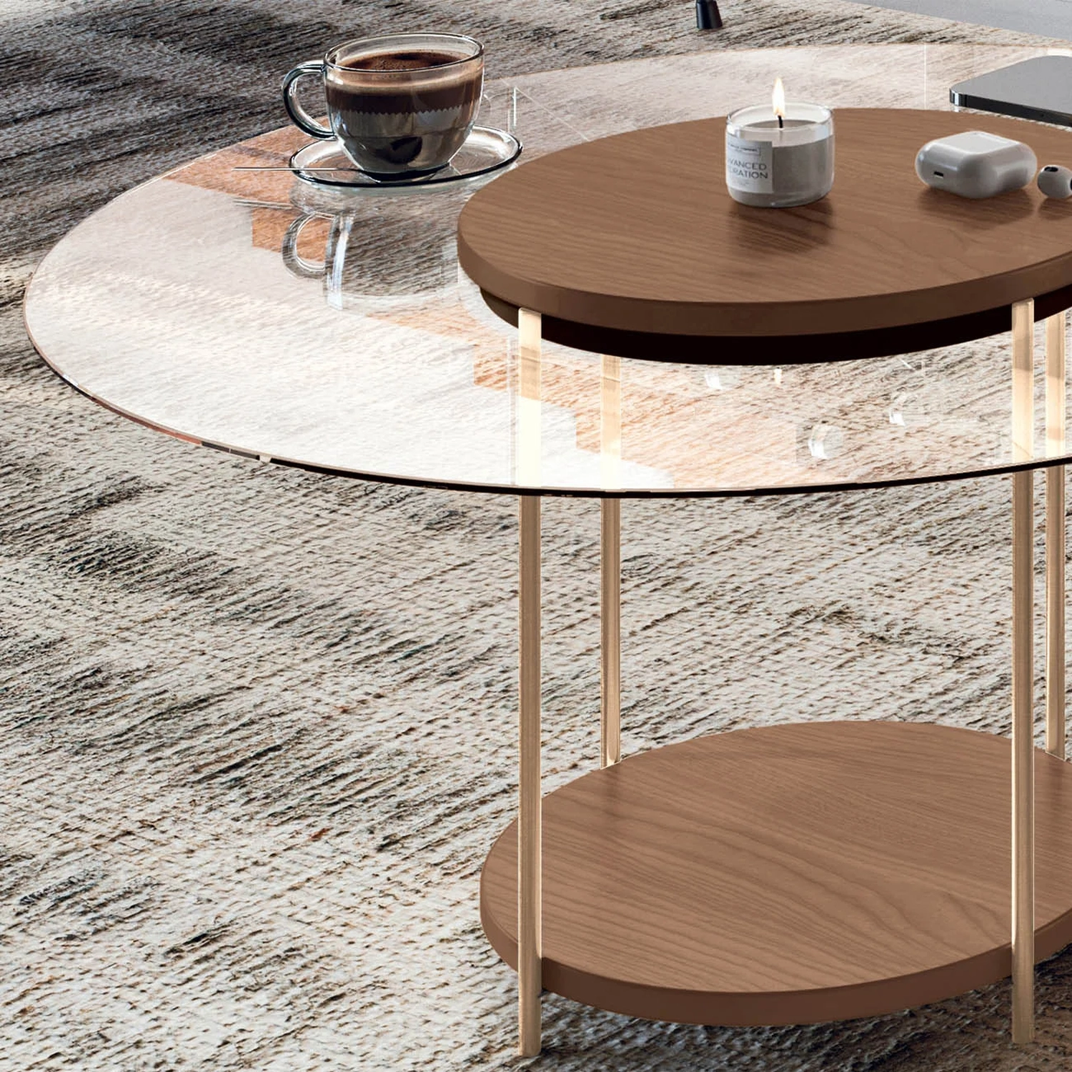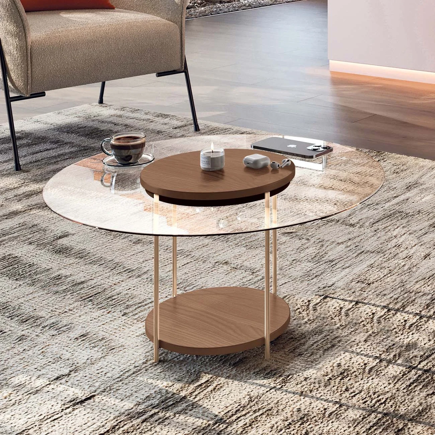 A Mesa de Centro Redonda Tampo de Vidro Sky Castanho, da HB Móveis tem um design sofisticado e contemporâneo, combinando diferentes materiais de forma harmoniosa, criando uma peça leve e ao mesmo tempo marcante.