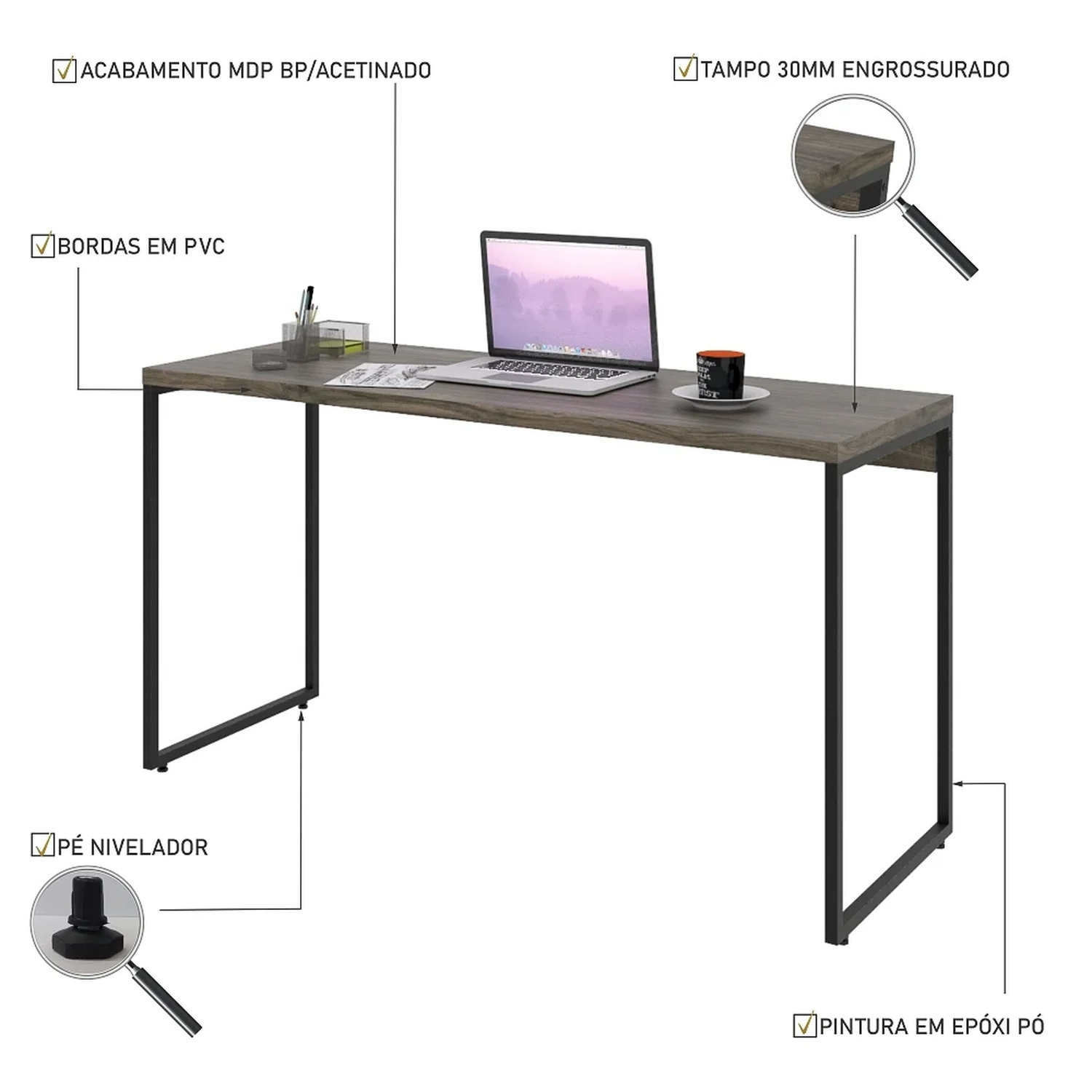 Então, que tal começar a organizar o seu cantinho de trabalho com a Mesa Escrivaninha Dynamica, da Mpozenato?! Essa mesa de escritório só tem pontos positivos, a começar pela sua qualidade, já que o tampo é fabricado em MDP com acabamento BP Acetinado e fitas de borda de PVC, o que garante maior resistência e durabilidade ao produto.