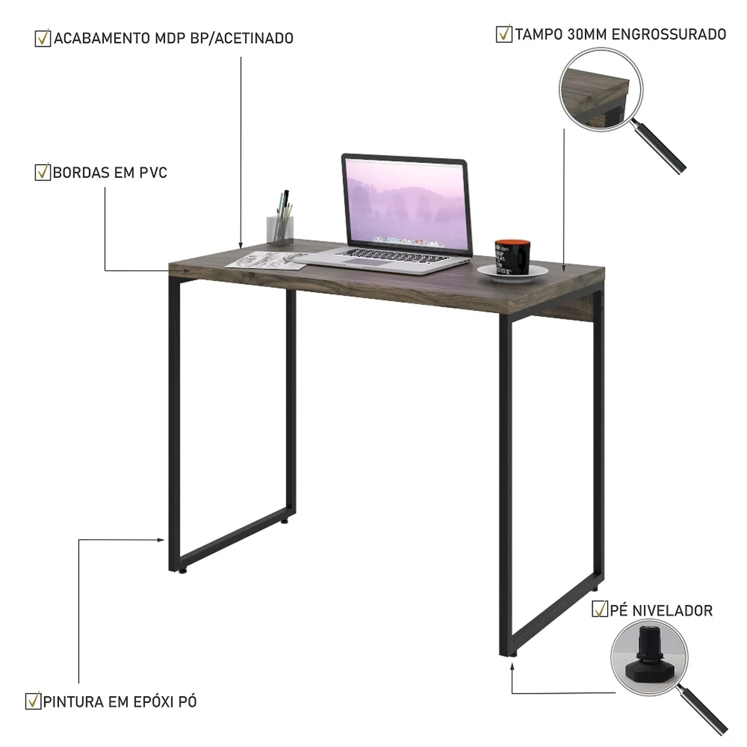 Então, que tal começar a organizar o seu cantinho de trabalho com a Mesa Escrivaninha Dynamica, da Mpozenato?! Essa mesa de escritório só tem pontos positivos, a começar pela sua qualidade, já que o tampo é fabricado em MDP com acabamento BP Acetinado e fitas de borda de PVC, o que garante maior resistência e durabilidade ao produto.