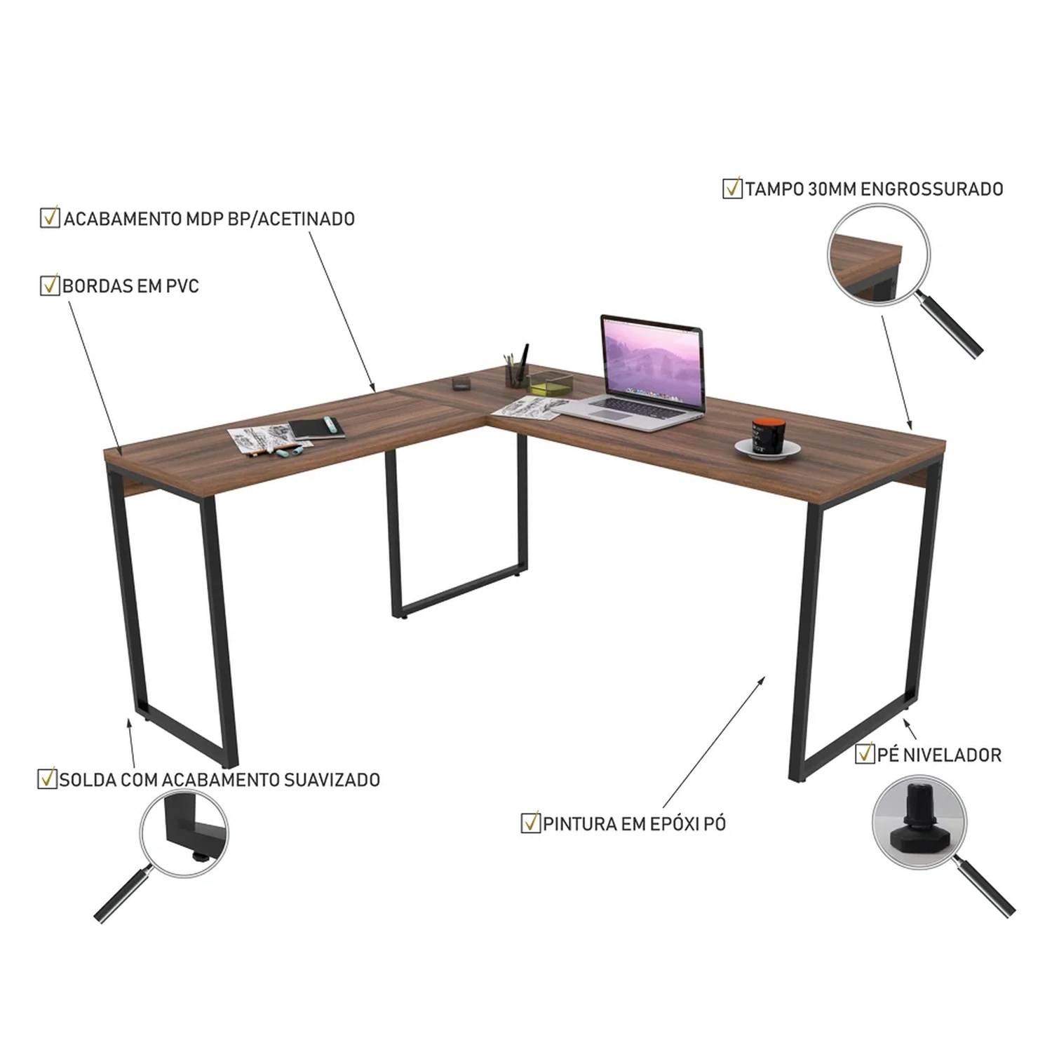 A Mesa de Escritório Office em L 150x150cm Estilo Industrial Prisma Nogal da Mpozenato, vai valorizar a decoração do ambiente com seu estilo industrial, harmonizando o metal e os tons de madeira resultando em um acabamento rústico misturado ao moderno. Produzida em MDP com tampo engrossado de 30mm, revestimento em BP, solda com acabamento suavizado e pintura epóxi a pó que proporciona maior durabilidade e resistência ao produto. Além disso, conta com pés niveladores e montagem da mesa auxiliar no lado direito ou esquerdo. Essa mesa pode ser utilizada em diversas composições com outros móveis, demais né?