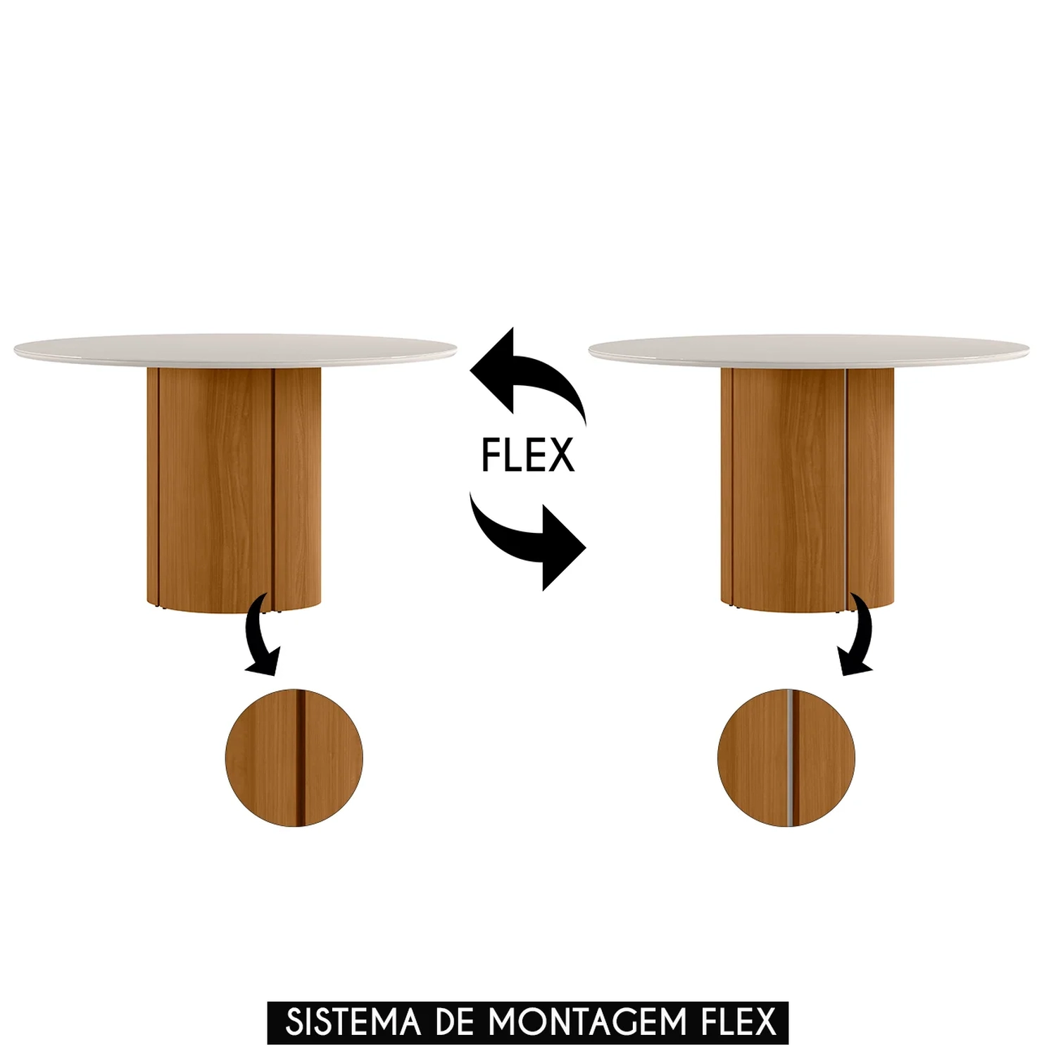 Sua base cilíndrica, com detalhes frisados e montagem flex, confere um visual contemporâneo e único. Acomoda confortavelmente até seis lugares, sendo perfeita para refeições em família ou encontros com amigos.