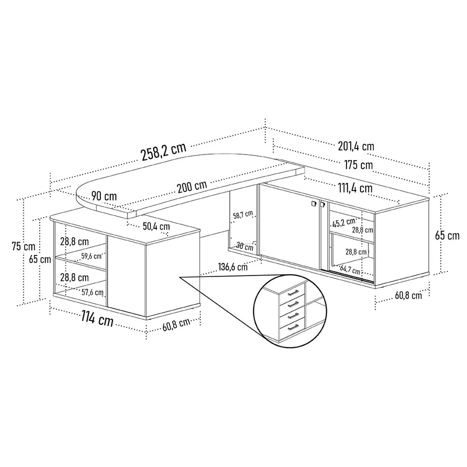 Com um sistema de conectividade que inclui tomada sobre o tampo, você pode manter todos os seus dispositivos eletrônicos sempre carregados e prontos para uso. Além disso, essa mesa possui amplo espaço de armazenamento interno, com prateleiras, portas e gavetas, permitindo que você mantenha sua área de trabalho livre de bagunça. Além disso, o tampo principal em Tamburato 50mm possui um design curvo e fica sobreposto, o que agrega ainda mais charme e elegância.