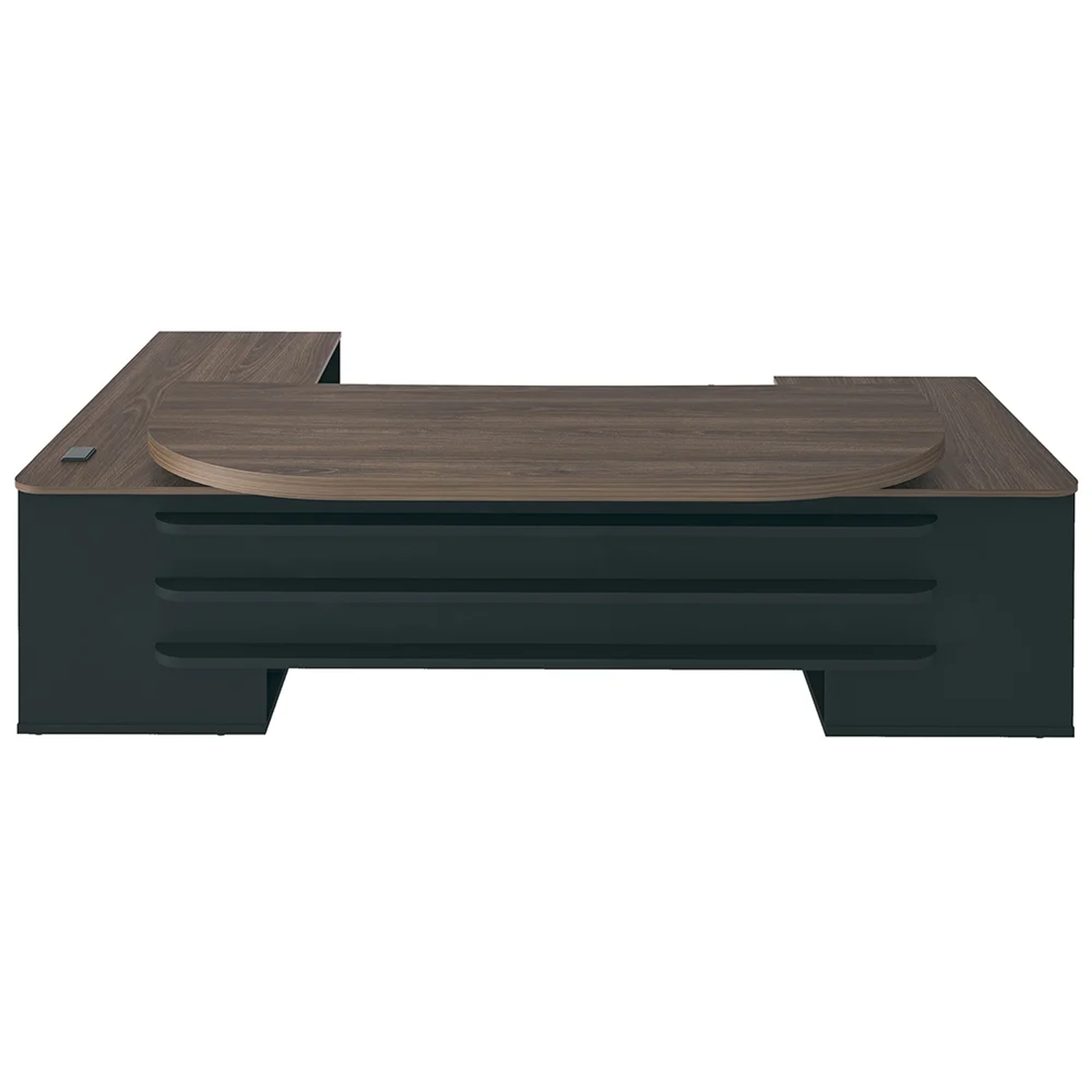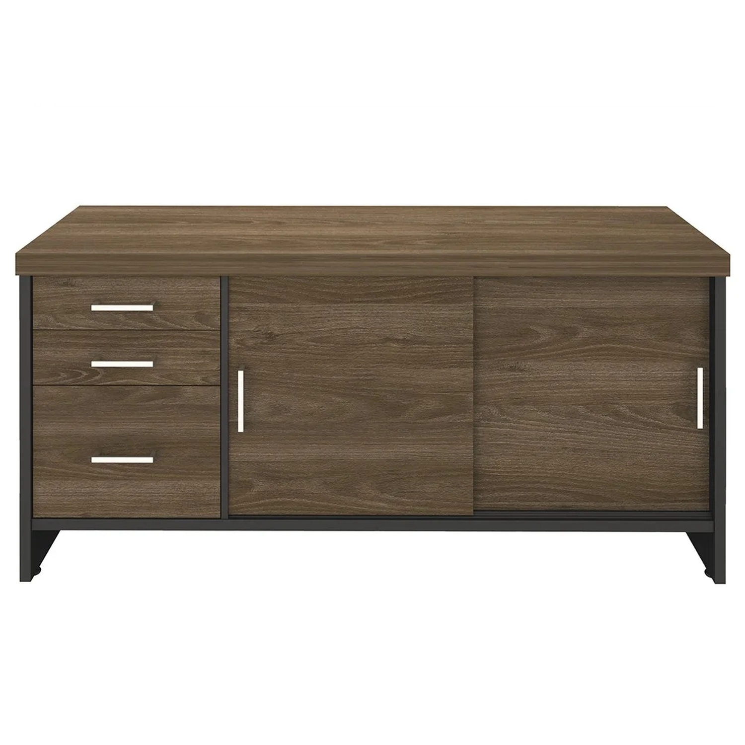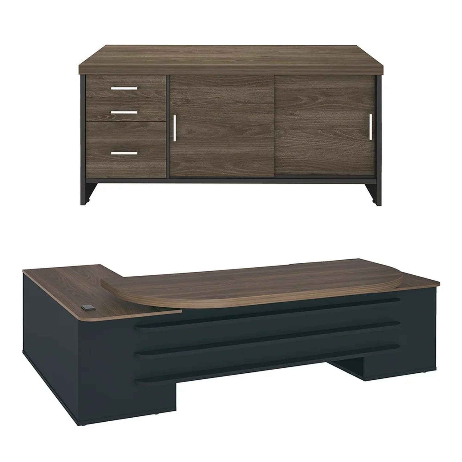 Otimize sua produtividade com o conjunto de escritório com Mesa Escritório Presidente e Balcão 2 Portas 3 Gavetas Corp A06 Charuto/Preto , da Mpozenato.