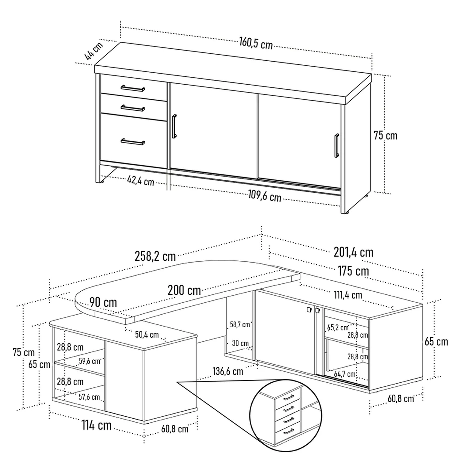 Esse conjunto exala charme contemporâneo e design imponente. A mesa para escritório rouba a cena com seu formato em U, além do amplo espaço interno com portas e gavetas, proporcionando armazenamento e estabilidade para todos os seus itens essenciais de trabalho. Já o balcão para escritório com 2 portas e 3 gavetas permite que você organize com praticidade pastas, documentos e suprimentos de trabalho.