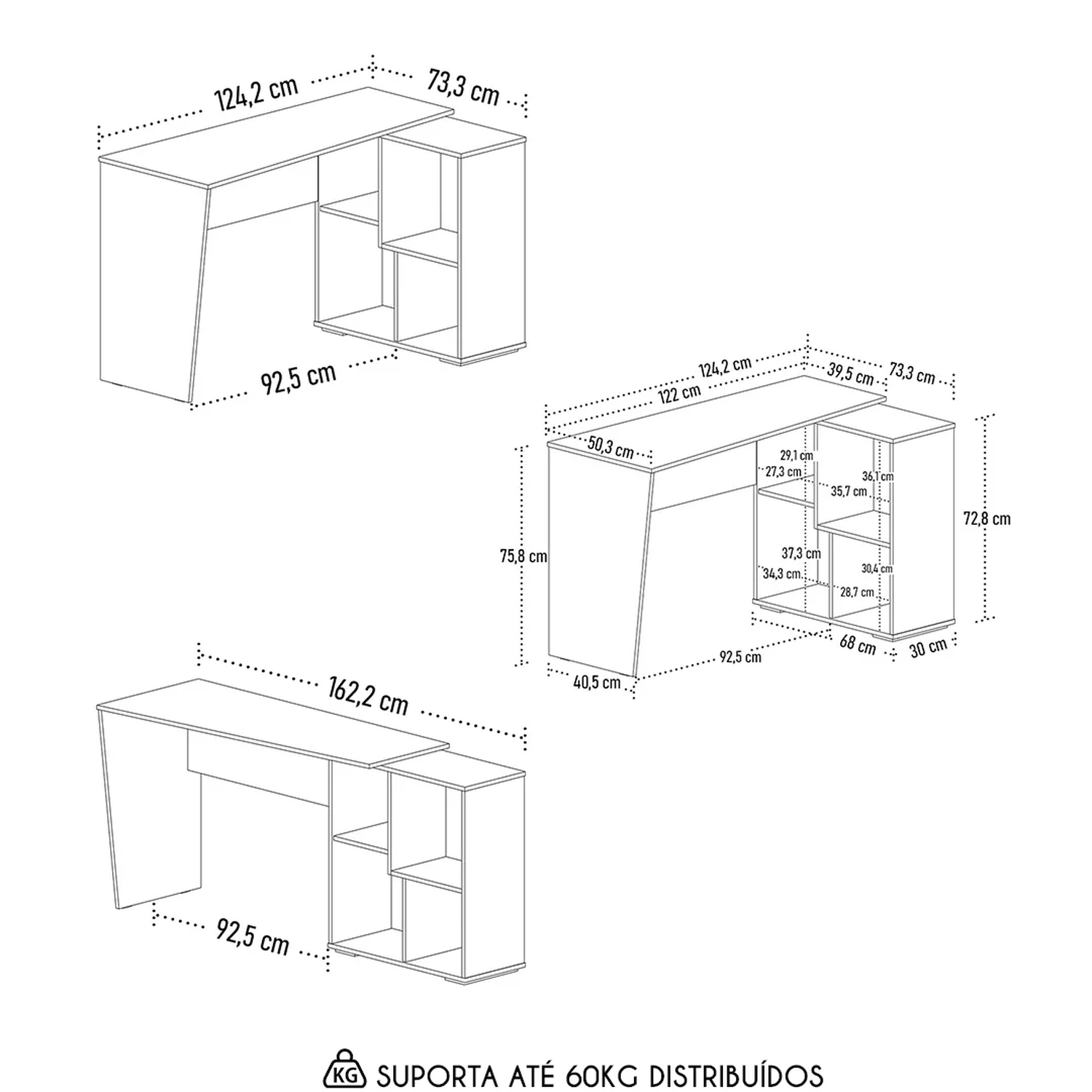 Largura total montagem reta: 162,2 cm.