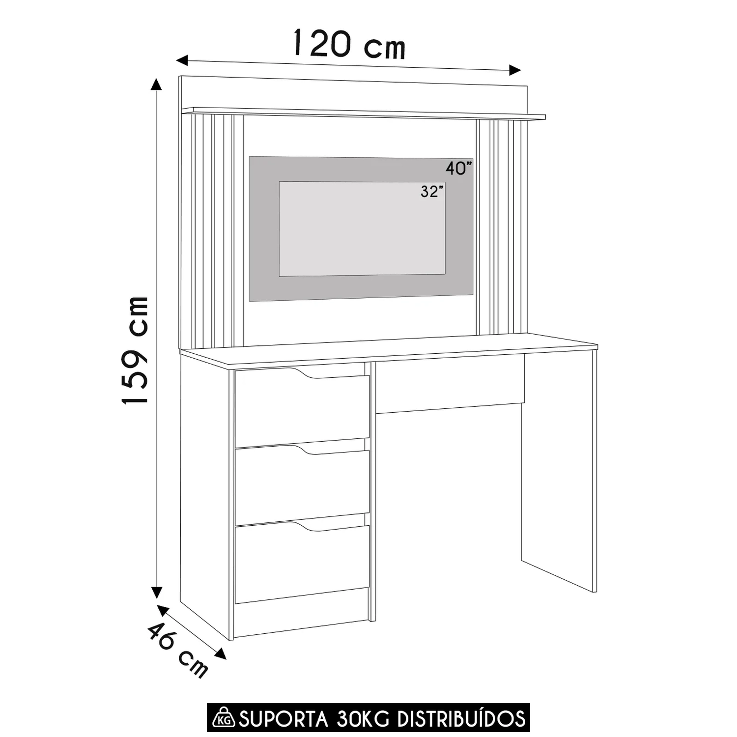 A Mesa Escrivaninha 3 Gavetas Painel TV 40 Pol Doble Branco, da Mpozenato, e funcional para quem busca organização e conforto no ambiente de trabalho ou estudo.