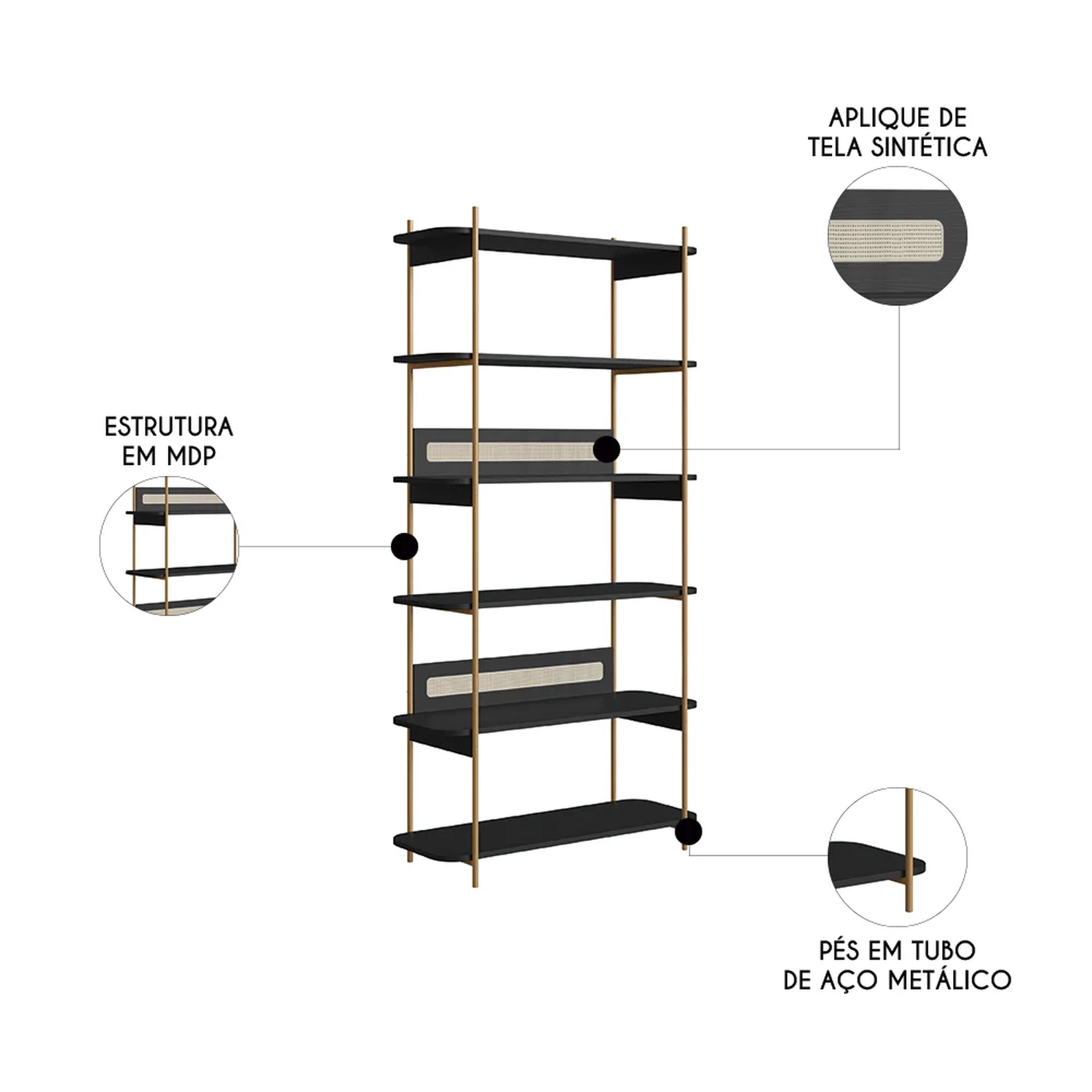 Conheça a Mesa Escrivaninha e Estante Pé Metal Arlo A10 Nero/Dourado, da Mpozenato, que transformará seu escritório ou home office em um ambiente elegante.