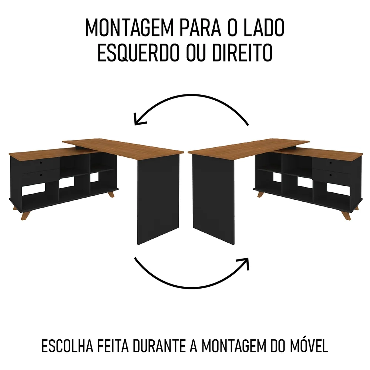 Além do design moderno e tonalidades sóbrias que harmonizam facilmente com qualquer ambiente e ainda dá aquele toque na decoração, essa mesa home office também é sinônima de versatilidade. Primeiro, por ser uma mesa em L leva otimização na circulação do cômodo, como proporciona uma ampla área de trabalho, segundo porque possui montagem flex, ou seja, você optar o lado que melhor se adequa ao seu ambiente; terceiro, possui traseira revestida, o que permite você aproveita-la em qualquer posição, inclusive como divisor de ambientes. Para completar a lista de atributos, os pés retrô agregam ainda charme à peça, ao passo que os nichos e gavetas amplas garantem espaços extras para organização de diversos materiais e objetos.