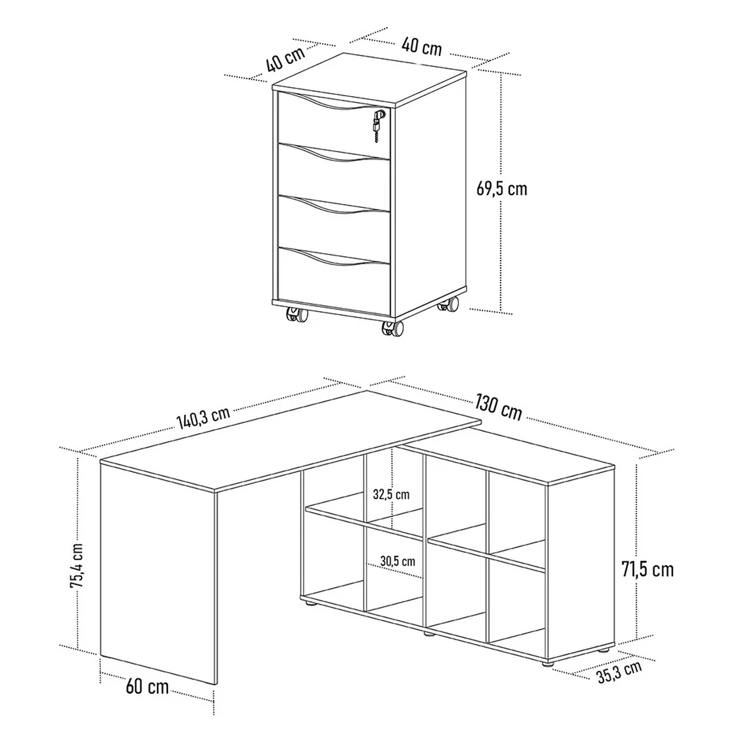 Mesa em L Eron: 140,3/130 x 75,4 x 60 cm.