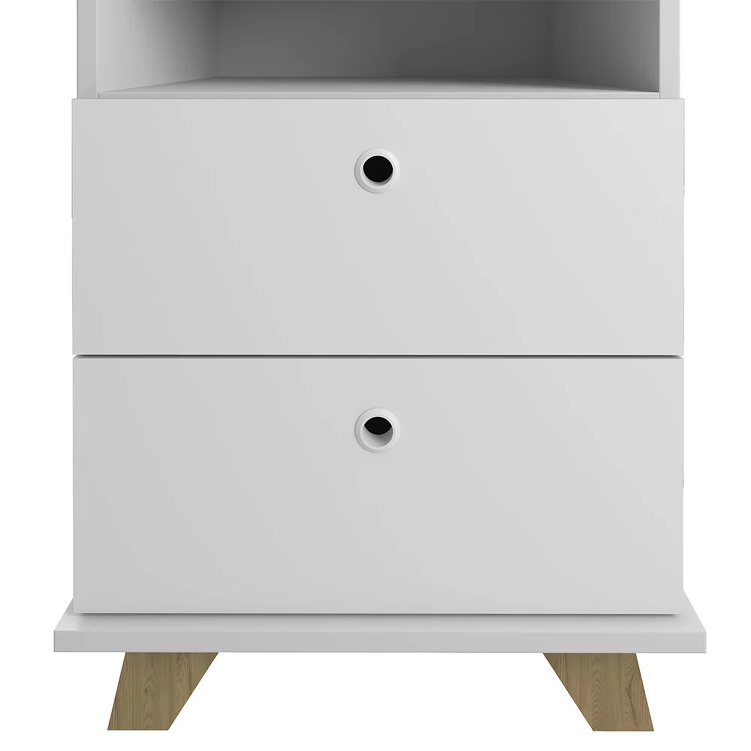 Não diferente, o gaveteiro 2 gavetas completa a beleza, ao passo que o tampo 18mm garante estrutura e resistência, suportando muito mais peso e valorizando o gaveteiro. Já o nicho é um espaço extra bastante estratégico, no qual você poderá expor decorações e dar um toque de personalidade que exprima o seu bom gosto.