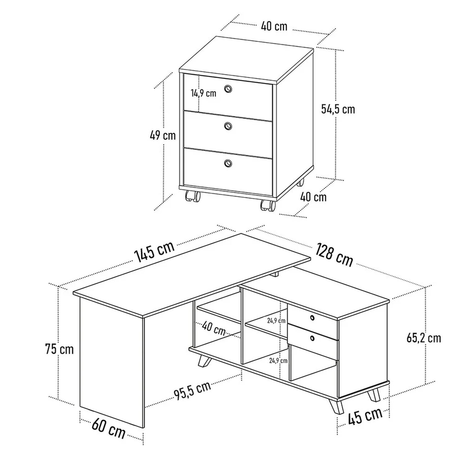 Conteúdo da Embalagem: 1 Mesa em L, 1 Gaveteiro.