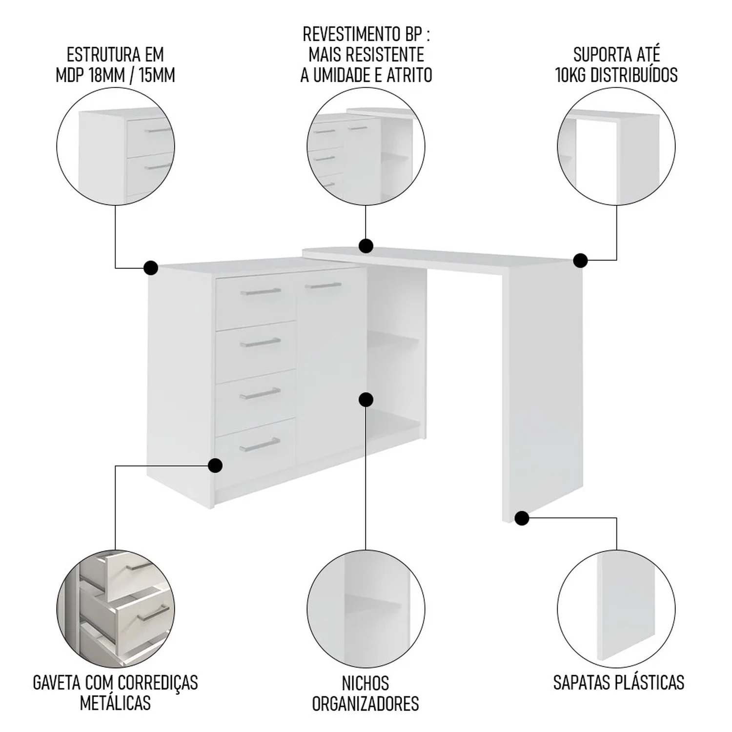 Material do tampo: MDP 18mm (mesa).
