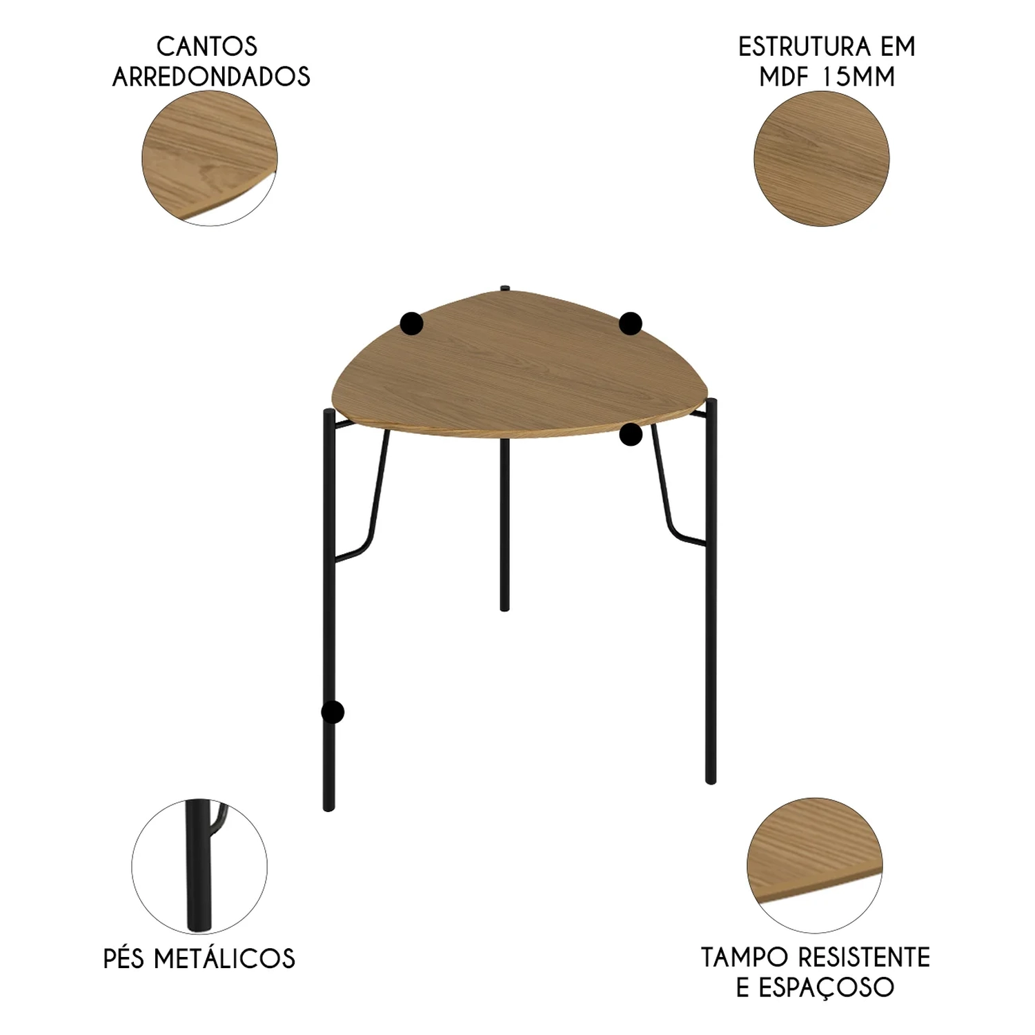 Os pés metálicos trazem estabilidade e leveza ao visual, criando um contraste elegante com o tampo. O formato com cantos curvos suaviza as linhas, proporcionando um charme extra e mais harmonia ao móvel.
