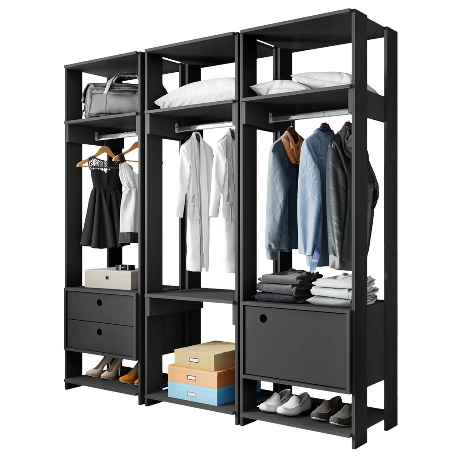 Com o Guarda Roupa Closet Titan seu ambiente fica belo e funcional do jeito que você deseja, atendendo assim todas as suas necessidades e ainda se adequa a qualquer espaço disponível. É composta por 3 módulos com estrutura em MDP de alta qualidade, e conta com 2 gavetas, 1 porta, 4 prateleiras e 3 cabideiros, tudo para facilitar a organização das suas roupas e sapatos. Perfeito, pois vai deixar seu quarto completo, moderno e com muita funcionalidade!