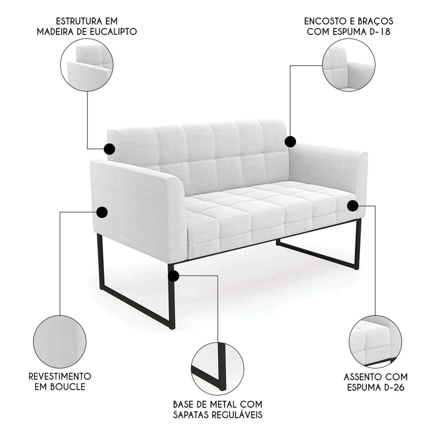 O Sofá Namoradeira e a Poltrona Para Sala são revestidos em Boucle, que é confortável, suave ao toque, e valoriza o design das peças. Eles têm braços e encosto em espuma D-18 e assento em espuma D-26, que oferecem firmeza e aconchego para você relaxar. A base industrial é um detalhe charmoso, que dá um toque moderno e sofisticado ao conjunto. O kit tem uma estrutura resistente e suporta até 120 kg cada peça. A montagem é simples, pois as peças já vêm prontas, bastando fixar a base com os parafusos que acompanham o produto. A limpeza é prática, pois basta usar um pano limpo e levemente úmido, sem produtos abrasivos, para manter o seu kit sempre em bom estado. Hora de transformar seu ambiente com a Namoradeira 2 Lugares e a Poltrona para Sala deixando ainda mais confortável e estiloso.
