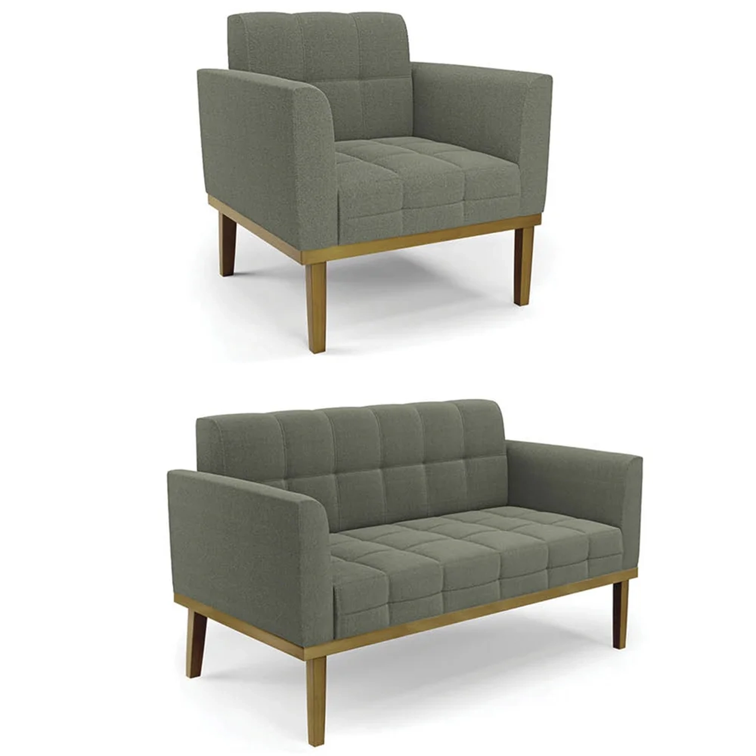 O Sofá Namoradeira e a Poltrona Para Sala são revestidos em Boucle, que é confortável, suave ao toque, e valoriza o design das peças. Eles têm braços e encosto em espuma D-18 e assento em espuma D-26, que oferecem firmeza e aconchego para você relaxar. A base em madeira de eucalipto castanho é um detalhe charmoso, que dá um toque rústico e sofisticado ao conjunto. O kit tem uma estrutura resistente e suporta até 120 kg cada peça. A montagem é simples, pois as peças já vêm prontas, bastando fixar a base com os parafusos que acompanham o produto. A limpeza é prática, pois basta usar um pano limpo e levemente úmido, sem produtos abrasivos, para manter o seu kit sempre em bom estado. Hora de transformar seu ambiente com a Namoradeira 2 Lugares e a Poltrona para Sala deixando ainda mais confortável e estiloso.
