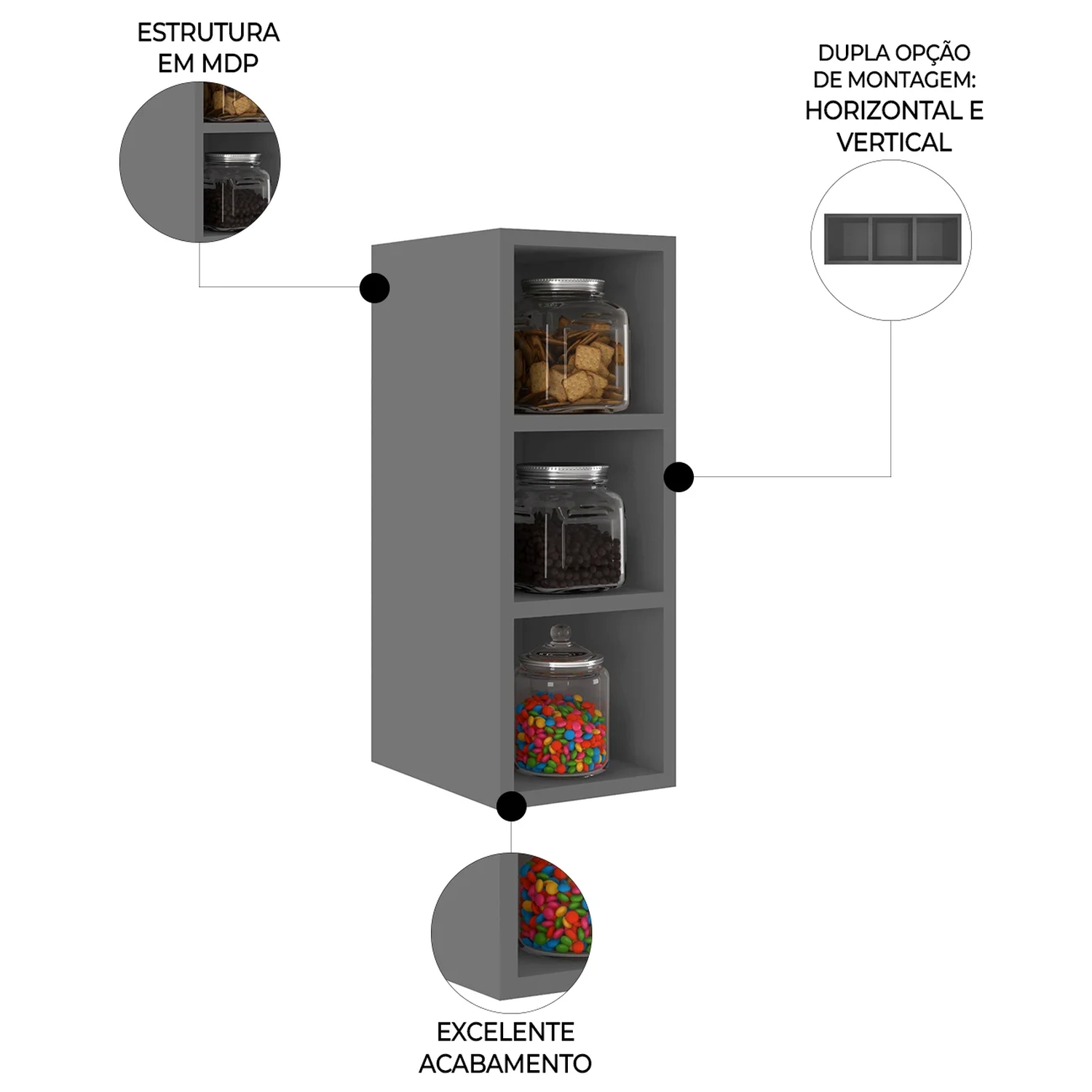 Fabricado em MDP 15mm, com acabamento em BP, garante maior resistência e durabilidade no uso, prolongando a vida útil do Nicho. Com três repartições, possui espaço para colocar bebidas, temperos ou objetos decorativos. Pode ser utilizado tanto na vertical quanto na horizontal, se adaptando facilmente às suas necessidades. Esse Nicho Aéreo é o complemento ideal para o seu ambiente, agregando praticidade e elegância à sua cozinha ou até mesmo a outros cômodos de sua preferência.