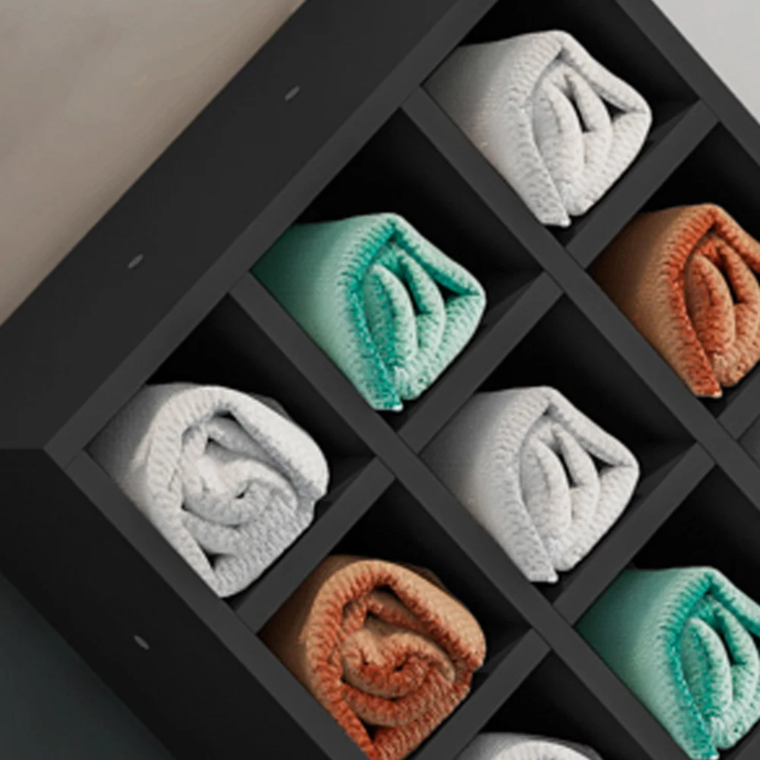 - 9 divisões para guardar toalhas ou acessórios.