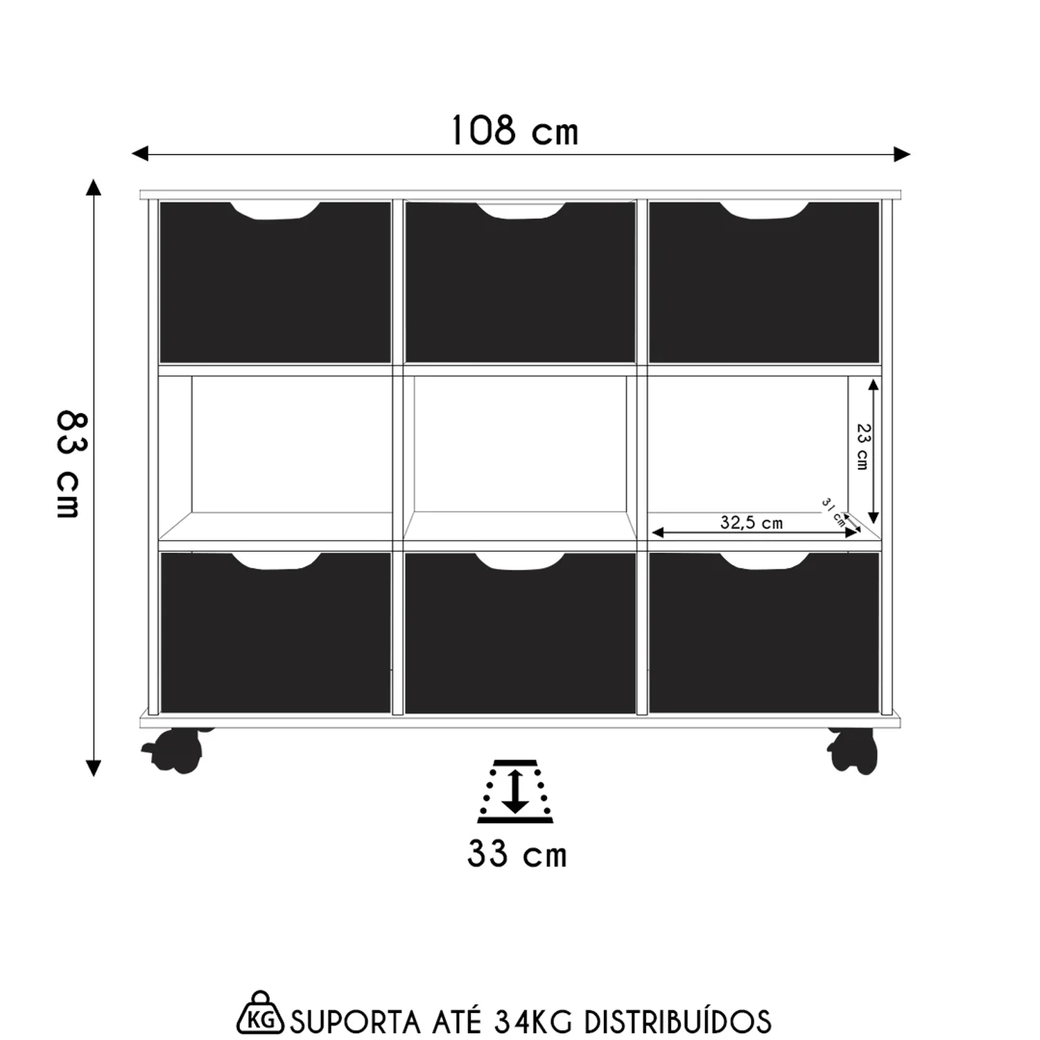 Peso suportado: 34 kg Distribuídos sem impactos.