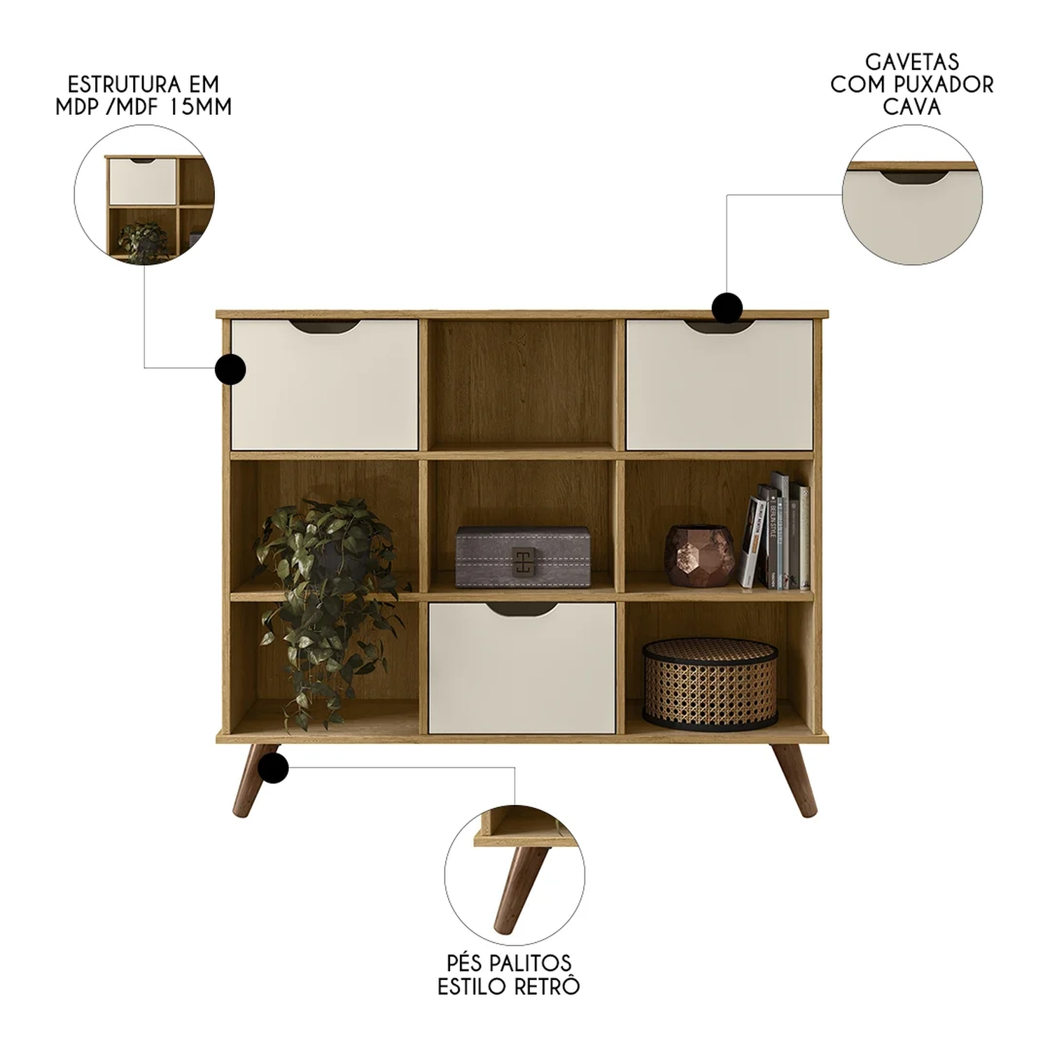 Com 6 Nichos abertos, oferece espaço suficiente para livros, objetos de decoração e brinquedos para o ambiente infantil, o Nicho Organizador, conta com 3 gavetas e detalhes curvos proporcionam um toque de minimalismo e sofisticação. A qualidade do Nicho Retrô em MDP e o acabamento em pintura UV asseguram a durabilidade do móvel. Os pés retrô não só adicionam um charme, como também protegem o móvel do contato direto com o chão, garantindo sua conservação. Este nicho é uma escolha inteligente para quem valoriza estética e praticidade no lar.