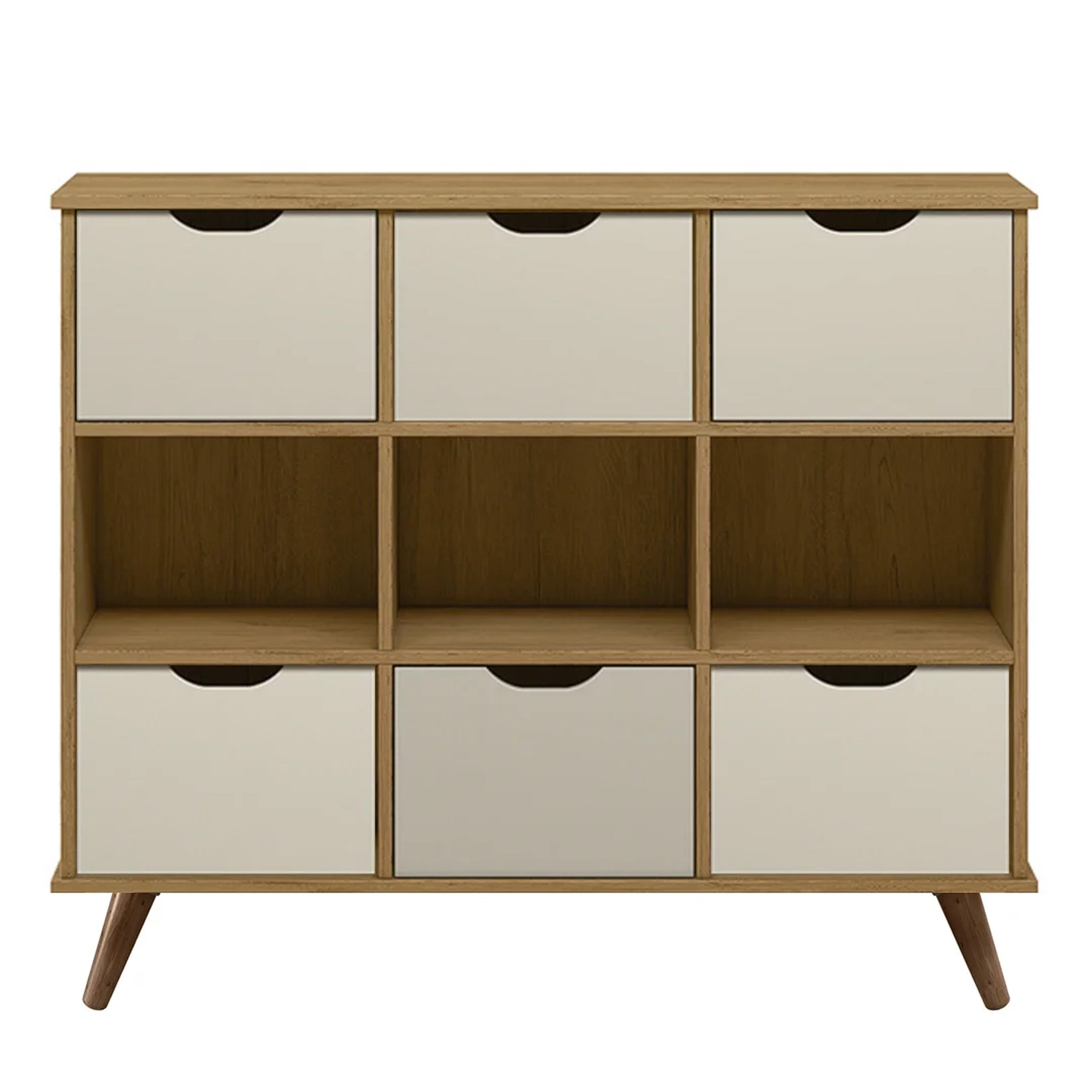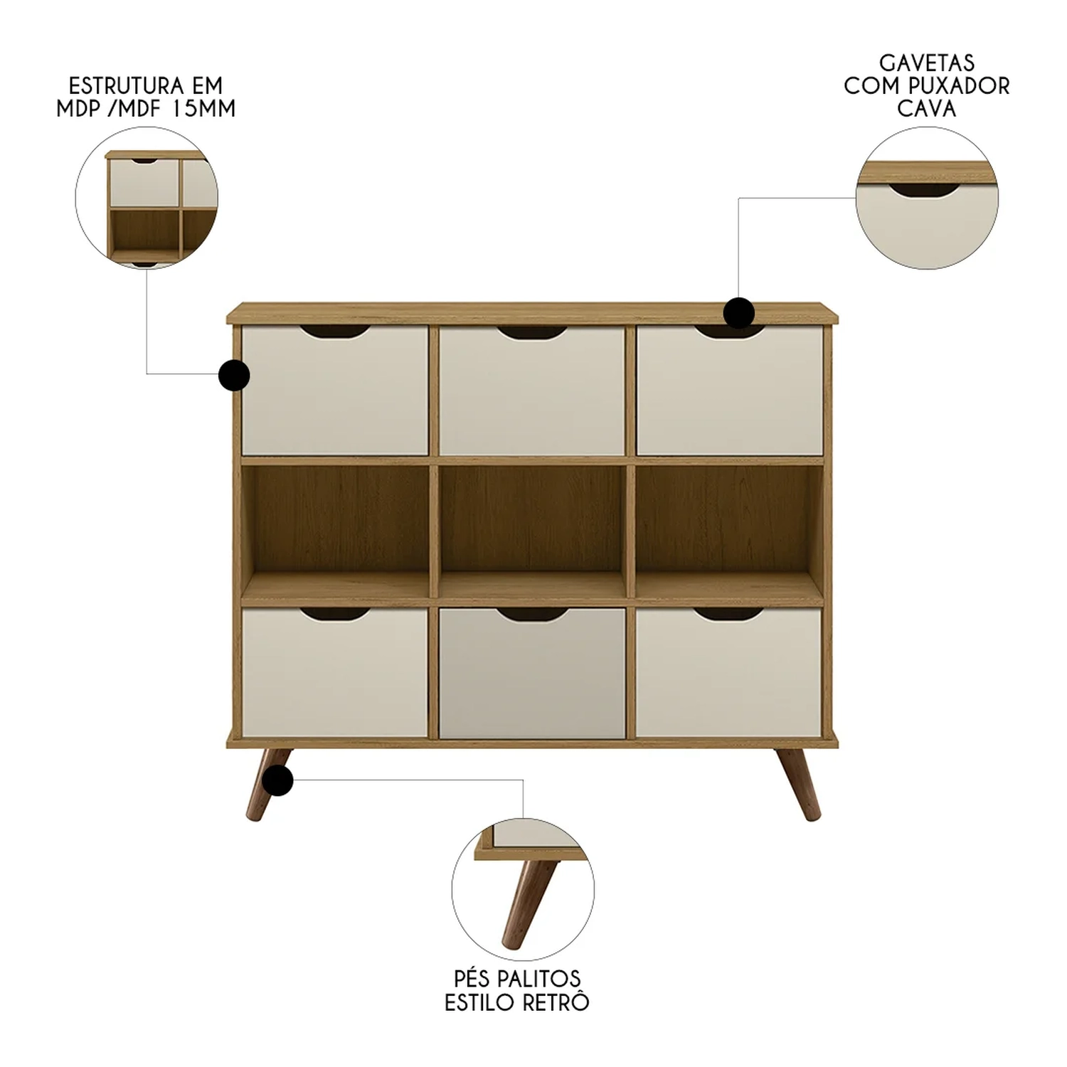 Com 6 Nichos Abertos, ele proporciona ampla capacidade de armazenamento para uma variedade de itens, desde livros e objetos decorativos até brinquedos, tornando-o uma adição versátil para qualquer cômodo. As 3 gavetas com detalhes em cavas adicionam um elemento de design sofisticado, enquanto a construção em MDP/MDF e o acabamento em pintura UV garantem a resistência e durabilidade do Nicho Multiuso. Os pés estilo retrô elevam o móvel, evitando o contato direto com o chão e contribuindo para a sua longevidade. Este Nicho Retrô não é apenas uma peça decorativa, mas também uma solução prática para manter a organização e a harmonia no ambiente doméstico.