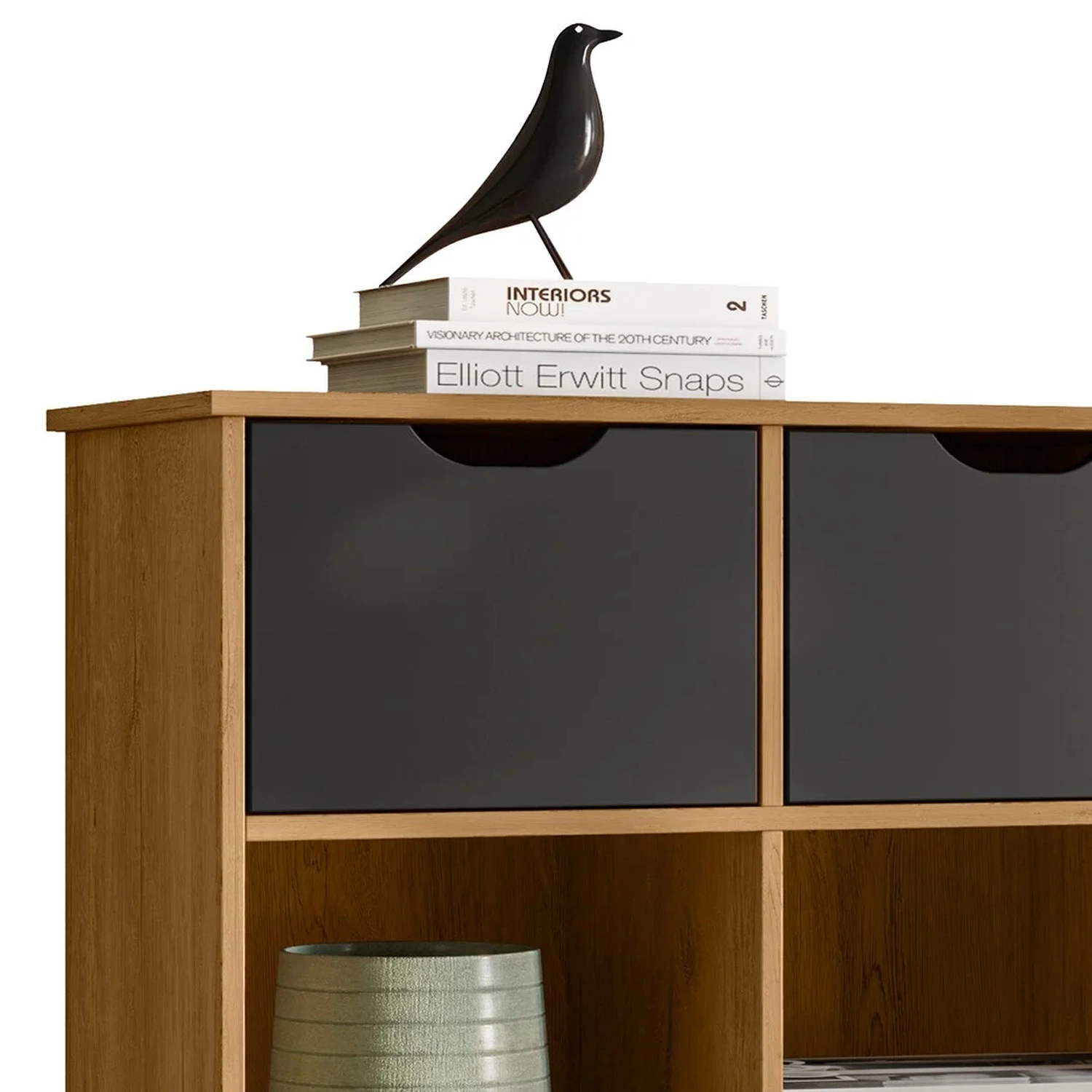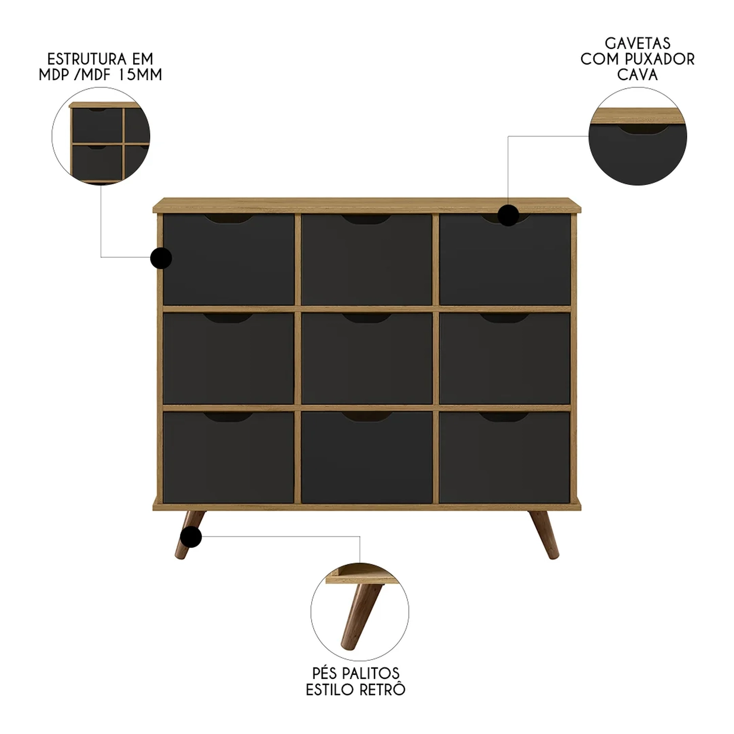 Descubra o charme e a praticidade do Nicho Organizador Retrô 9 Gavetas Freijó/Preto da Qmovi, uma peça que une elegância e utilidade em perfeita harmonia.