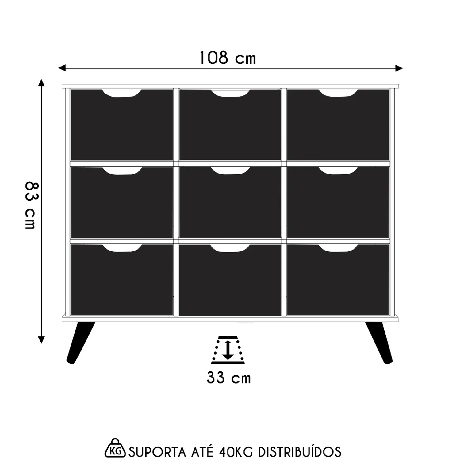 Contando com 9 gavetas com detalhes em cavas adicionam um elemento de design sofisticado, enquanto a construção em MDP/MDF e o acabamento em pintura UV garantem a resistência e durabilidade do Nicho Multiuso. Com 9 Nichos Abertos, ele proporciona ampla capacidade de armazenamento para uma variedade de itens, desde livros e objetos decorativos até brinquedos, tornando-o uma adição versátil para qualquer cômodo, os pés estilo retrô elevam o móvel, evitando o contato direto com o chão e contribuindo para a sua longevidade. Este Nicho Retrô não é apenas uma peça decorativa, mas também uma solução prática para manter a organização e a harmonia no Quarto Infantil.