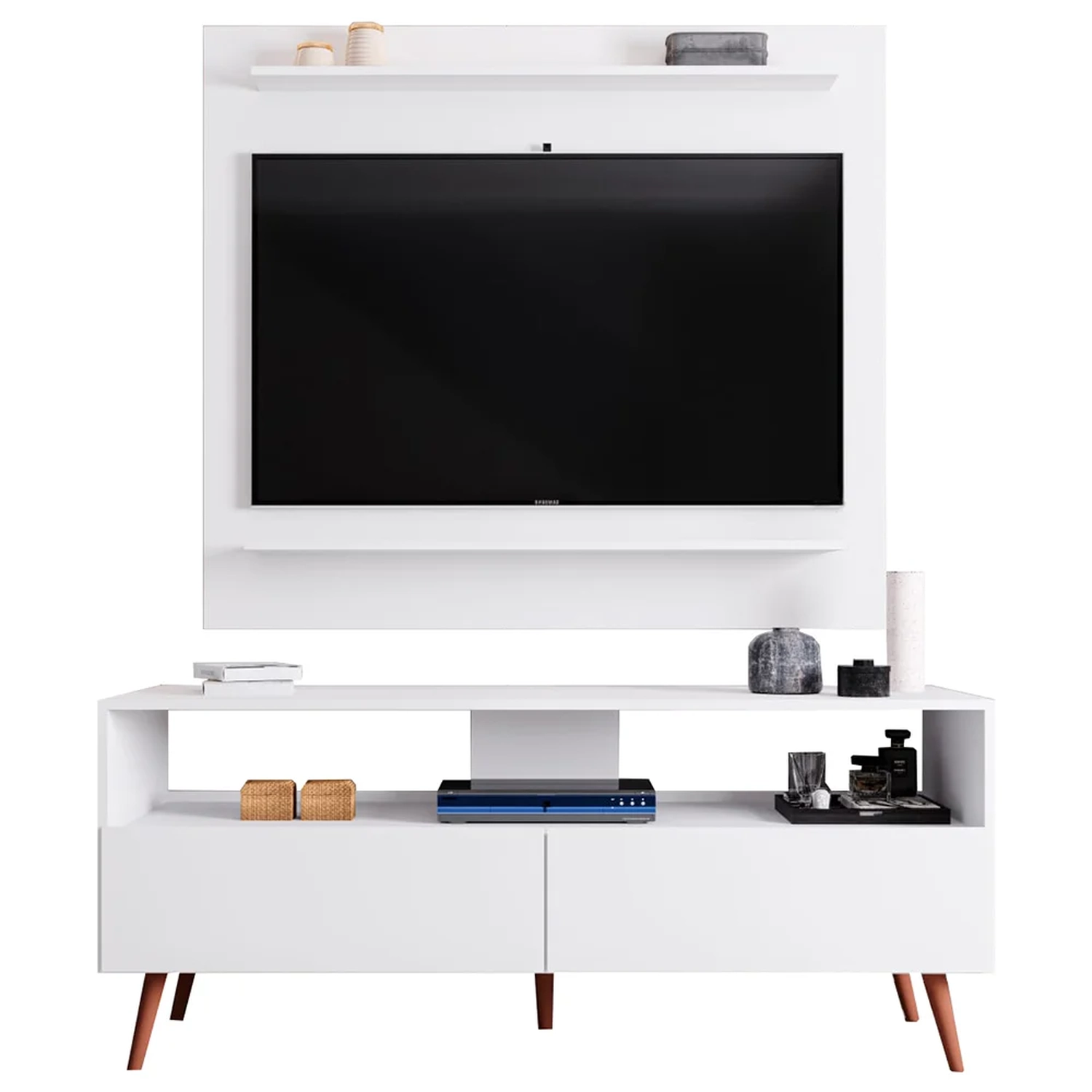 Transforme sua sala de estar em um verdadeiro paraíso de organização e estilo com o incrível e encantador Painel para TV 50 Pol Senna e Rack Bancada 136cm Versa Z34 Branco, da Mpozenato.