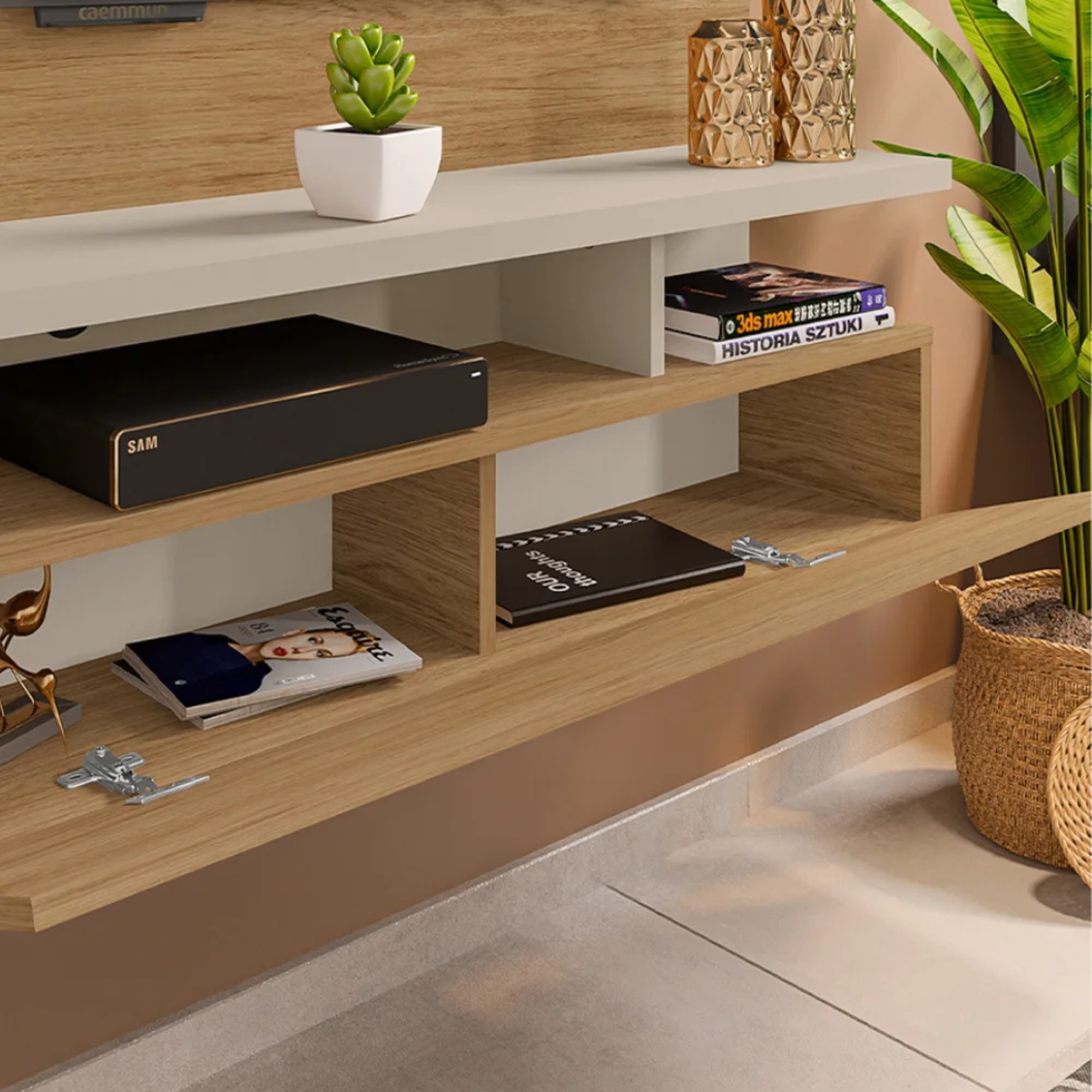 Projetado para TVs de até 55 polegadas, esse painel suspenso se destaca pela elegância bicolor em tons naturais que adiciona um toque de requinte a qualquer sala de estar ou quarto. Com 136cm de largura e tampo robusto de 25mm, ele oferece resistência e estabilidade para seus objetos mais valiosos. Mais que apenas um painel para TV, é uma solução inteligente para manter a organização, principalmente com os nichos estrategicamente distribuídos juntamente com a porta basculante, os quais são perfeitos para acomodar livros, dispositivos eletrônicos e até itens decorativos. E mais, tudo isso fica suspenso do chão, conferindo uma sensação de amplitude ao espaço.