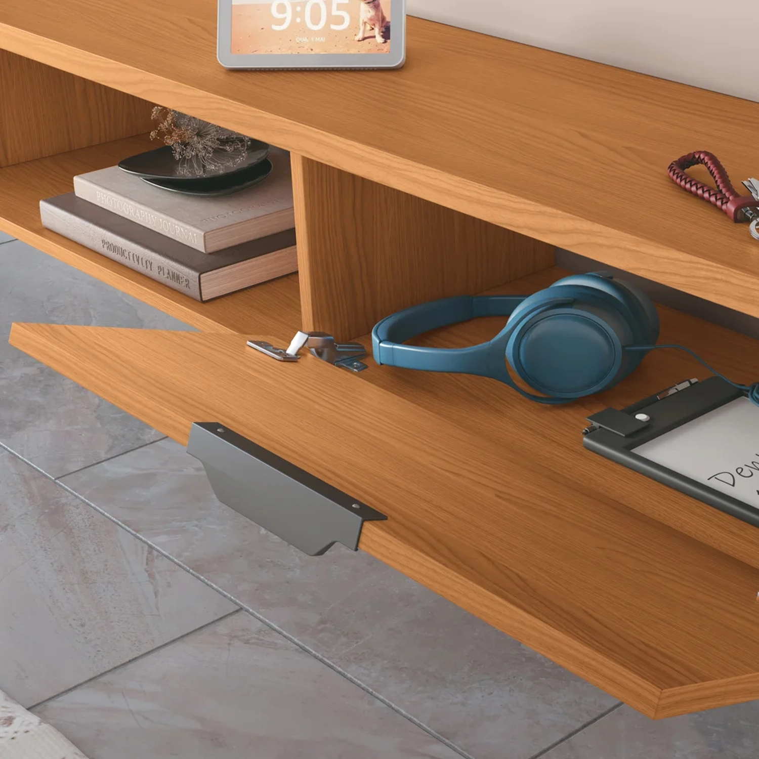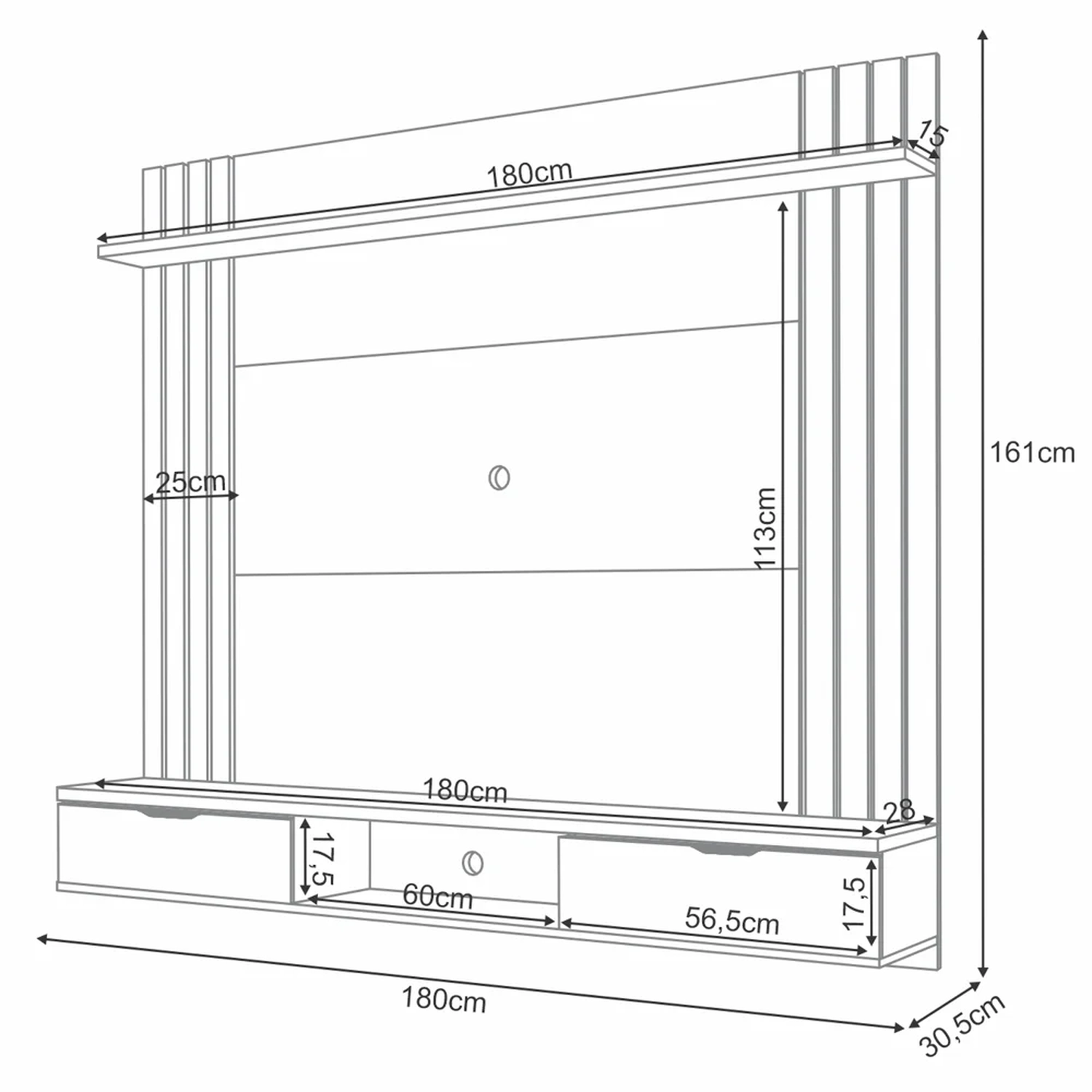 Ele é ideal para TV de até 70 polegadas fixada no painel, garantindo uma visão confortável e uma decoração moderna. Ele tem detalhes laterais ripado, que dão um toque de charme e elegância ao ambiente. Além disso, o painel conta com tampo e prateleira superior com espessura de 25mm, que oferecem resistência e 1 nicho para objetos decorativos ou eletrônicos. O Painel Suspenso também tem duas portas basculantes com dobradiças metálicas, que facilitam a abertura e o fechamento. As portas têm puxador em poliestireno com acabamento na cor champanhe, que combinam com o Design Moderno. O painel é produzido em MDP e MDF de 25mm e 15mm, que garantem durabilidade e qualidade ao produto.
