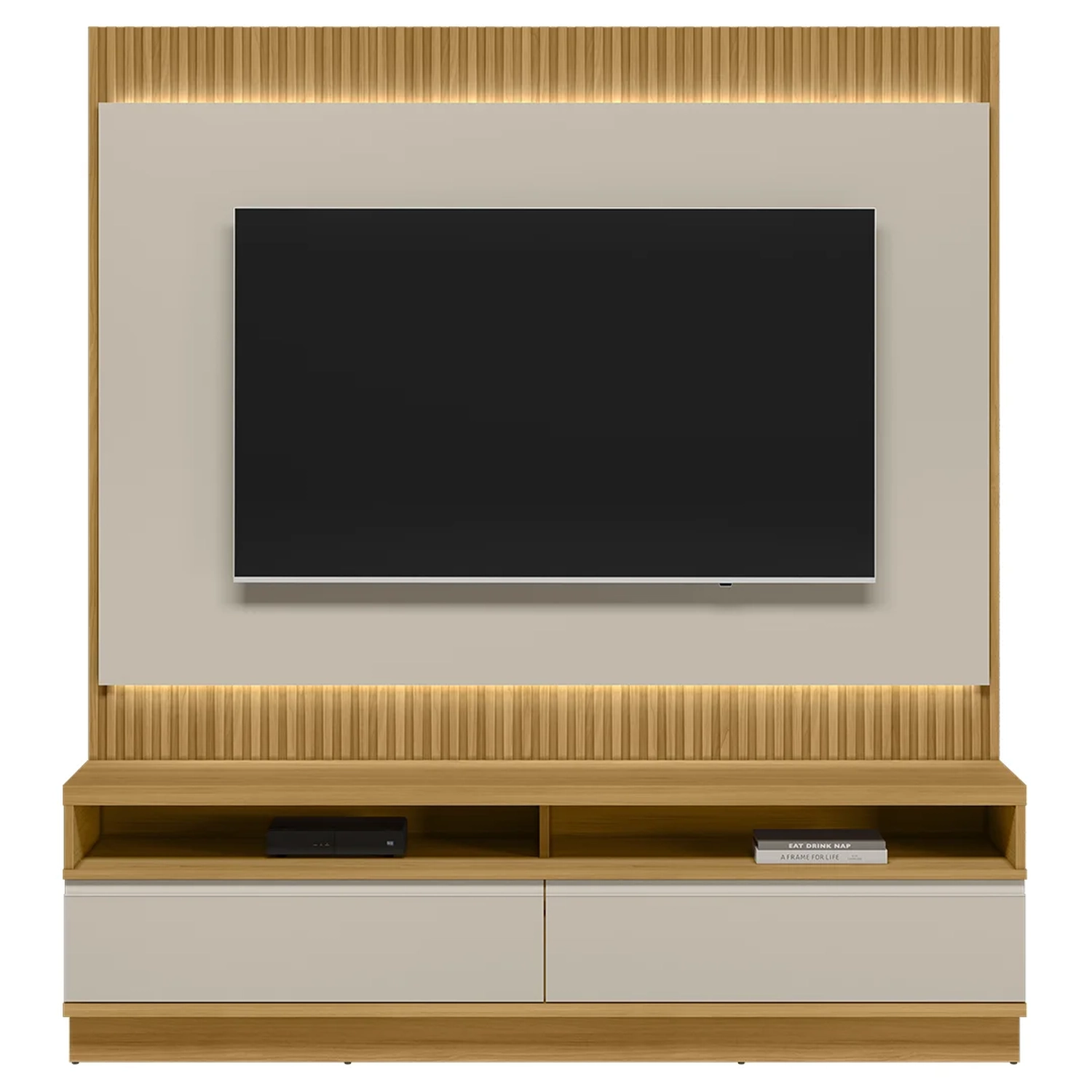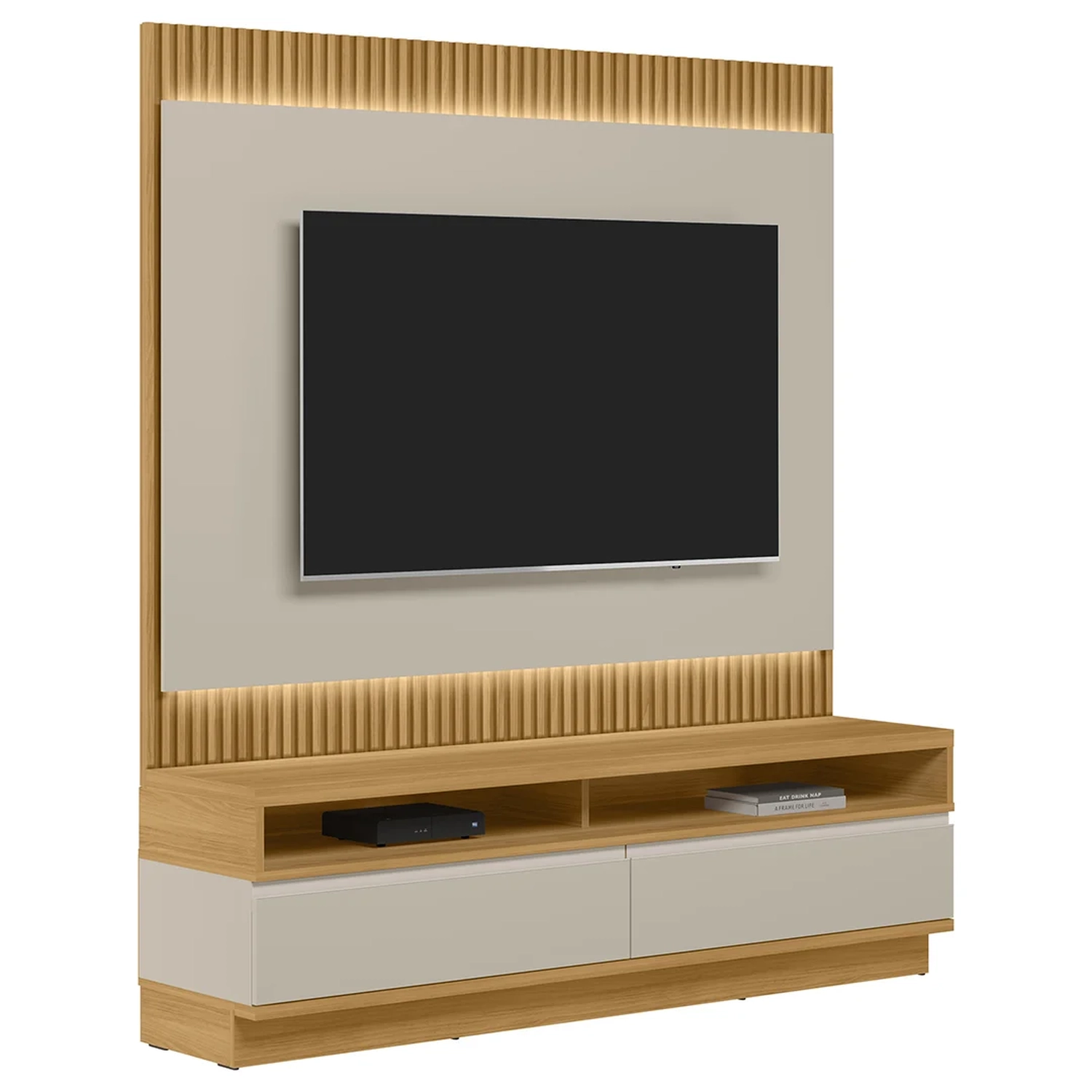 - Painel com detalhe ripado e luminária LED.