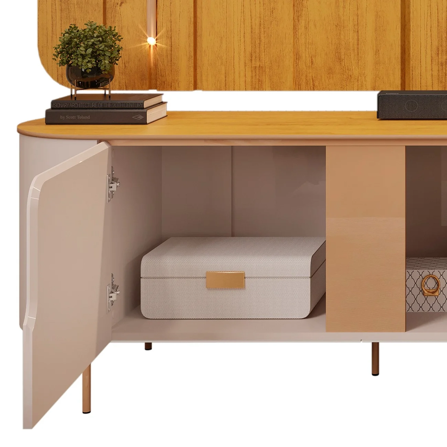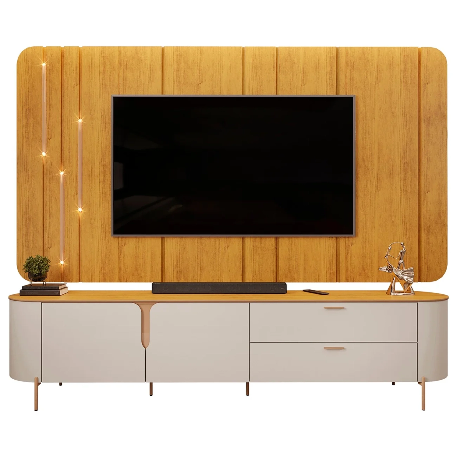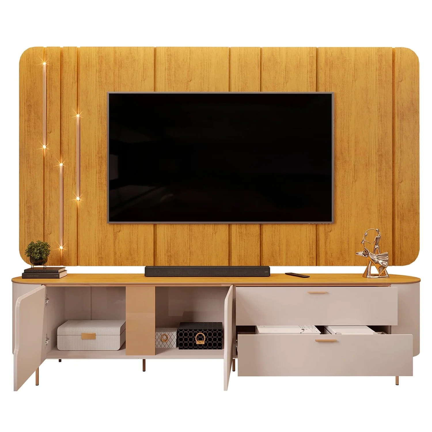 Este Rack Bancada conta com design contemporâneo, laterais e tampo curvados, e detalhes dourados que trazem um ar de luxo. Com duas portas com dobradiças metálicas e gavetas espaçosas, oferece praticidade e elegância para organizar seus itens. Além disso, a estrutura metálica dourada e os pés elevados garantem durabilidade e facilitam a limpeza. Já o Painel Suspenso é o complemento perfeito para este conjunto. Com cantos arredondados e divisões chanfradas, ele acomoda TV de até 75 polegadas com elegância e segurança. O painel possui luminárias douradas, que proporcionam um toque adicional de sofisticação ao produto. Fabricados em MDF de alta qualidade e ecológico, a bancada e o painel são a escolha ideal para quem busca beleza e praticidade.