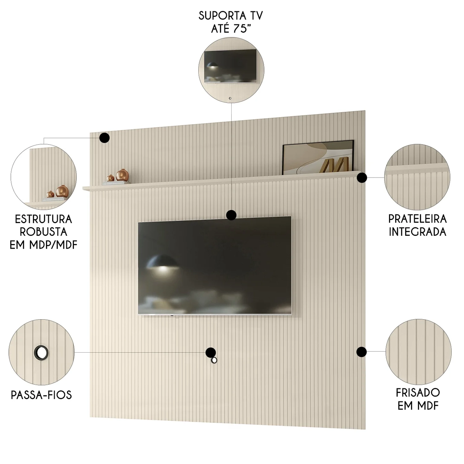 Com um design moderno e acabamento refinado, o Painel oferece funcionalidade e um toque elegante à decoração. Sua estrutura é composta por MDP e MDF de 12 e 25mm, garantindo resistência e durabilidade. O Painel de TV conta com acabamento frisado em MDF adiciona um detalhe charmoso ao painel, tornando-o um destaque no ambiente. Projetado para ser fixado na parede, ele proporciona um visual clean e otimiza o espaço da sua casa. Além disso, conta com uma prateleira superior para acomodar itens decorativos, aparelhos eletrônicos e acessórios, agregando ainda mais praticidade ao dia a dia.