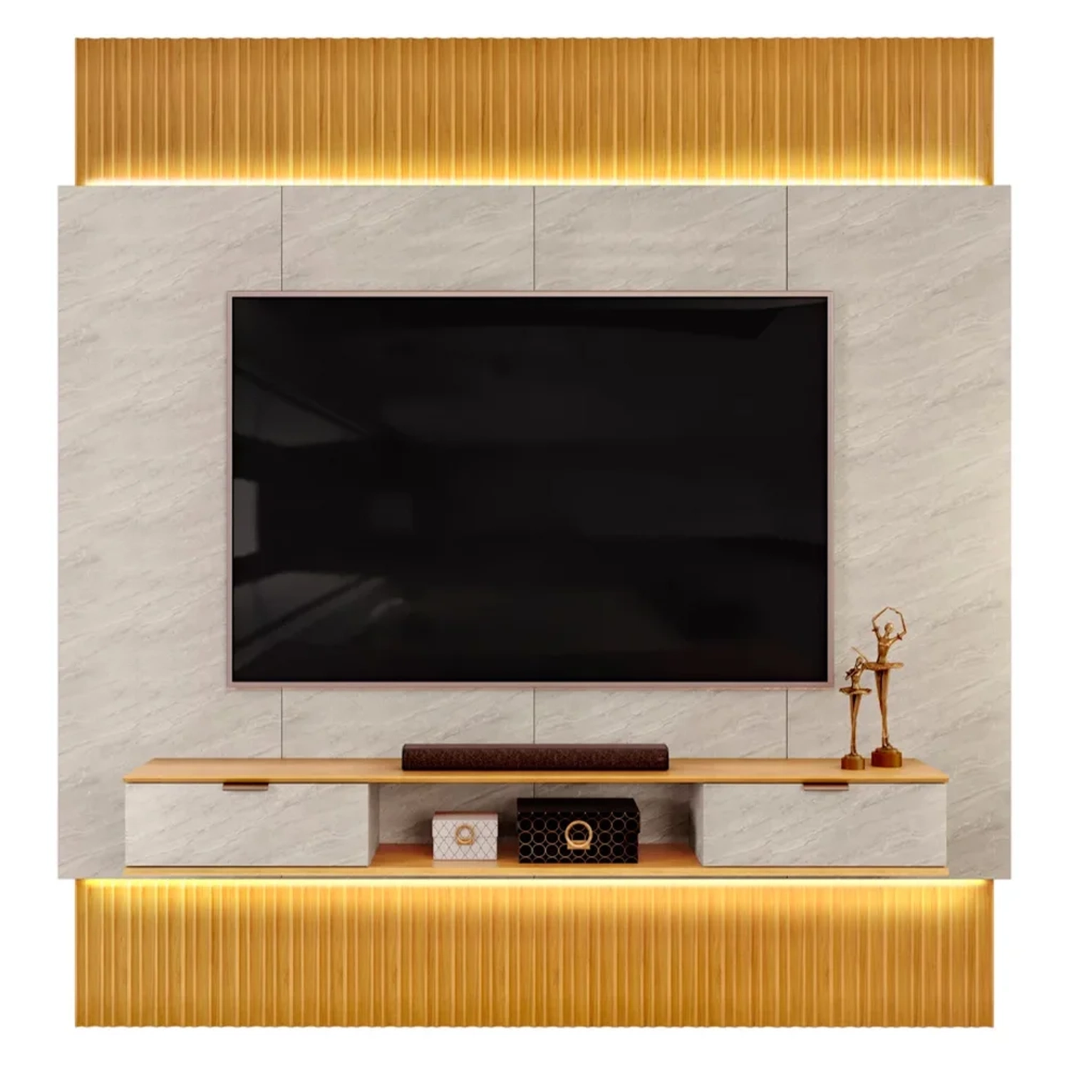 Um Painel de TV inovador é a definição de funcionalidade e estilo, com um espaço que suporta TVs de até 85 polegadas. Imagine só o melhor do entretenimento para sua família em um móvel tão elegante! E não para por aí, uma bancada suspensa com tampo e base chanfrados, duas gavetas espaçosas com corrediças telescópicas e um nicho para aparelhos eletrônicos ou decorações completam o design. As abas ripadas extensíveis, que vão do piso ao teto, são o toque final e permite que você transforme qualquer espaço com sua estética elegante e iluminação indireta via fitas de LED. Produzido 100% em MDF sustentável, o Painel Extensível não só embeleza sua casa, mas também contribui para a preservação do meio ambiente. É mais do que um móvel, é um upgrade na decoração da sua casa.