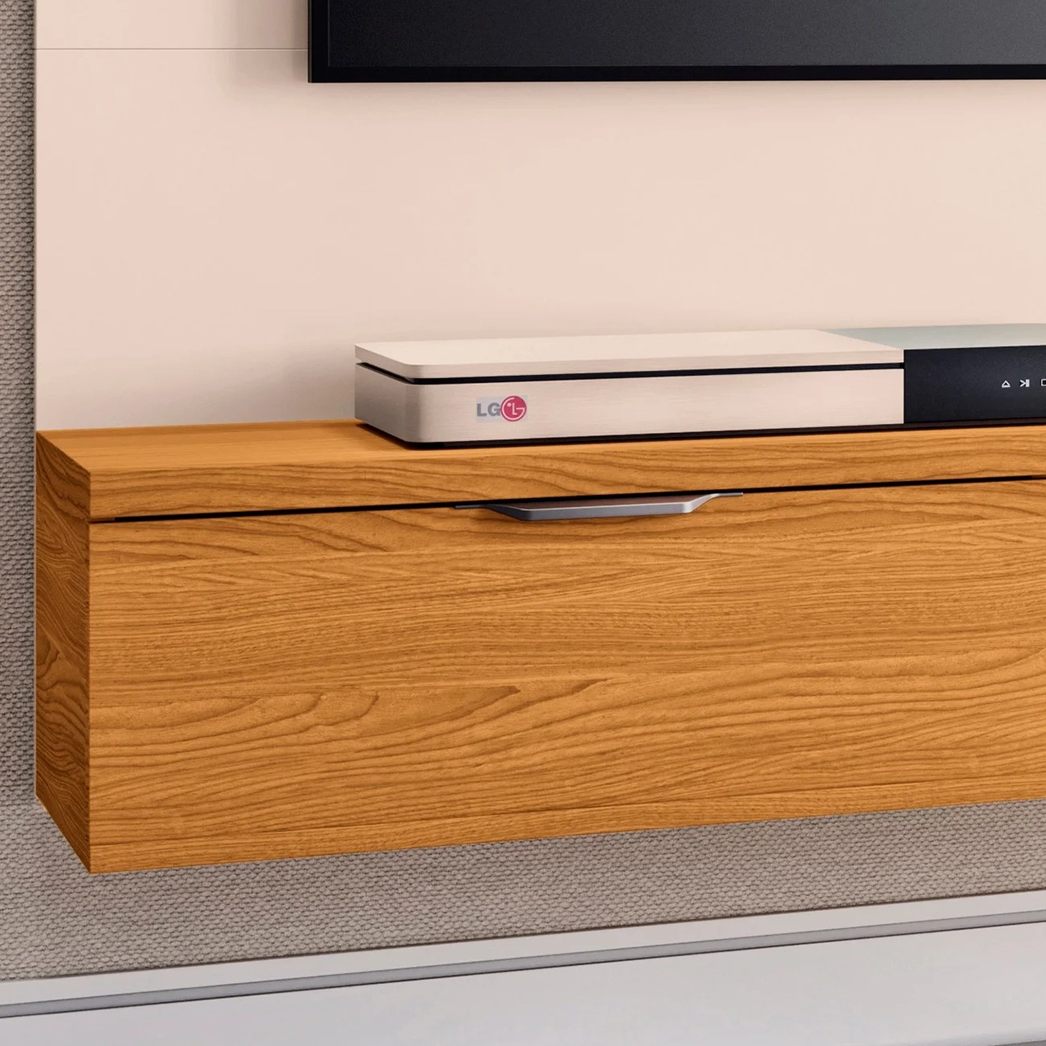 Este Painel Suspenso é a escolha ideal para quem busca aliar estilo e praticidade. Compatível com TVs de até 55, ele conta com um detalhe lateral ripado que traz um toque moderno e elegante ao seu ambiente. A prateleira superior e o tampo têm espessura de 25mm, oferecendo robustez e suporte para aparelhos eletrônicos e objetos decorativos. Além disso, o painel conta com 2 portas basculantes equipadas com dobradiças metálicas, e pistão a gás garantindo durabilidade e fácil manuseio. O puxador em poliestireno com acabamento na cor champanhe traz sofisticação e modernidade ao design. Produzido com MDP e MDF de alta qualidade, esse painel é resistente, durável e perfeito para quem deseja um móvel funcional e elegante para sua casa. Além disso, conta com um prático nicho embutido, ideal para acomodar objetos decorativos, eletrônicos ou acessórios, oferecendo ainda mais versatilidade ao ambiente. Não perca a oportunidade de transformar sua Sala de Estar, com esse Painel Para TV,que combina beleza, praticidade e qualidade, criando um ambiente ainda mais acolhedor e organizado.