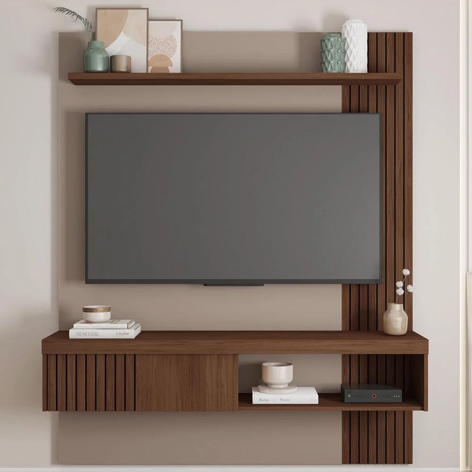 Ele tem uma estrutura resistente de MDP/MDF, com pintura UV que garante maior durabilidade e resistência. O Painel Para TV conta com uma prateleira superior de 25mm, ideal para colocar objetos decorativos ou eletrônicos, um nicho espaçoso, que permite guardar livros, revistas ou DVDs, e um espaço amplo no tampo, que pode ser usado para apoiar caixas de som ou outros acessórios. Além disso, o Painel Suspenso tem uma porta deslizante, que facilita o acesso aos itens guardados e ajuda a manter a sala sempre arrumada. O painel suporta TV até 55 polegadas, garantindo uma ótima visão para assistir seus programas favoritos. O painel tem um design moderno e sofisticado, com detalhes em frisos decorativos que dão um toque de charme e elegância.